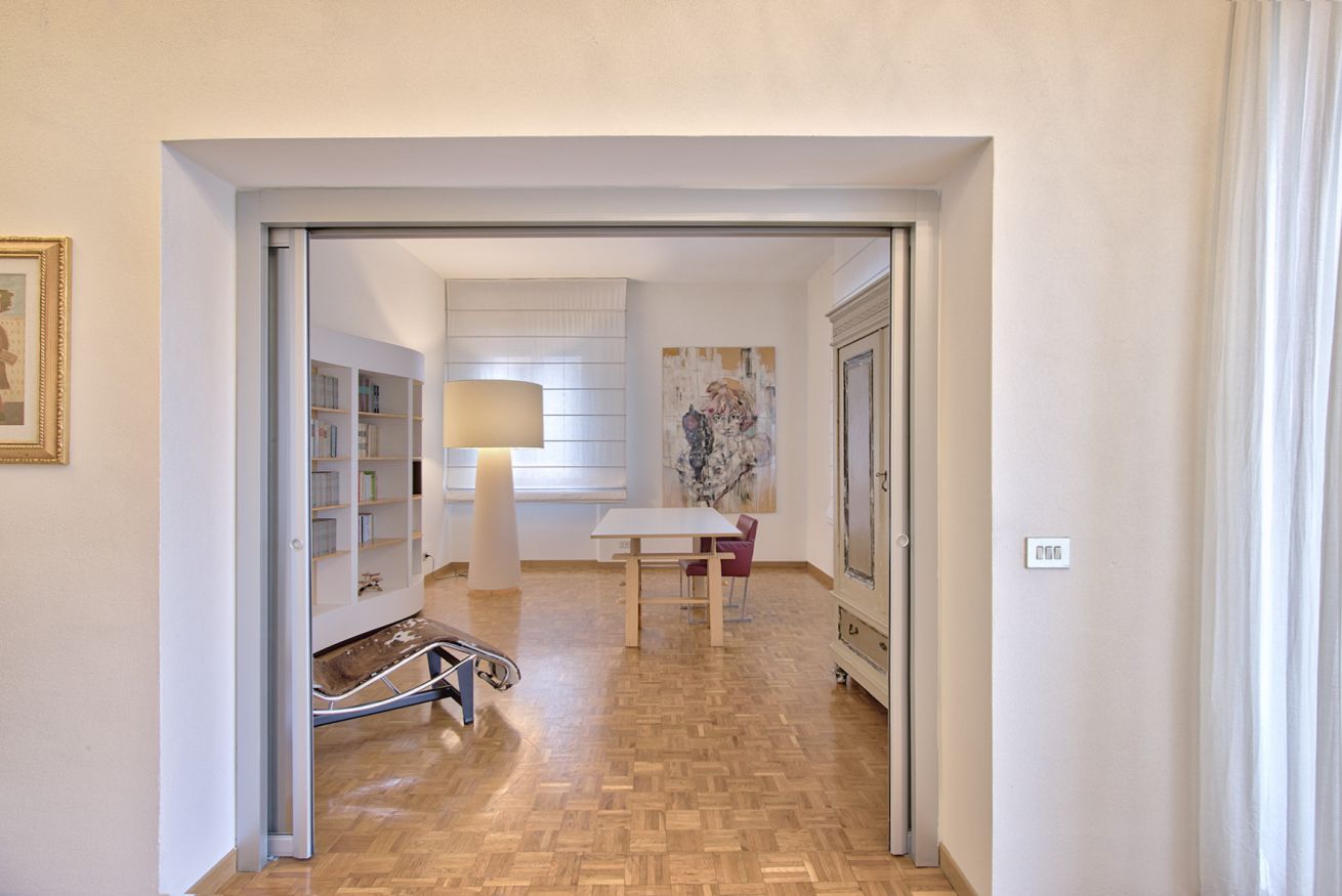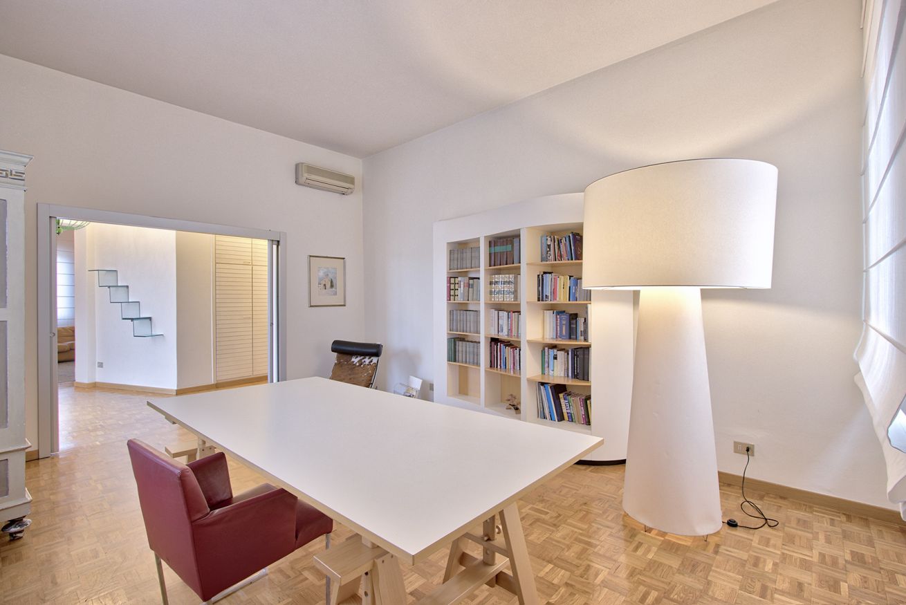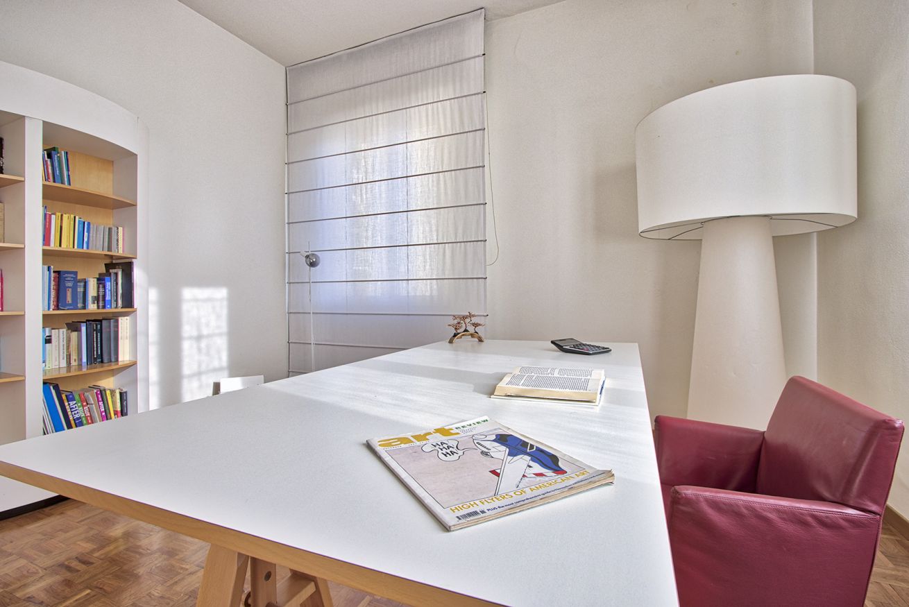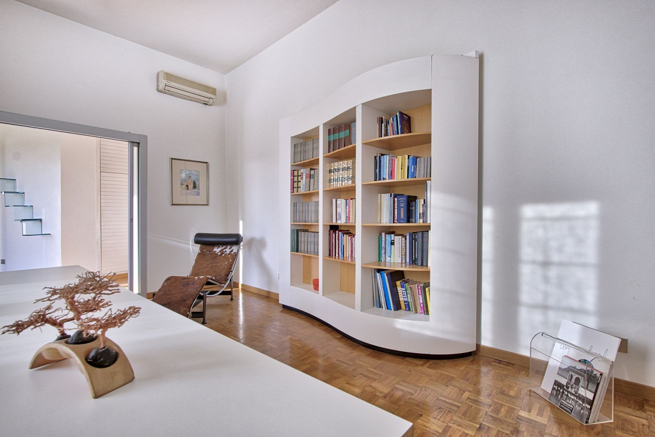 A completare la proprietà, uno studio moderno ed elegante, arredato con grande attenzione al design: un ambiente perfetto per lavorare, leggere o dedicarsi alle proprie passioni, arricchito da una libreria su misura, un tavolo da lavoro ampio e una poltrona che aggiunge personalità e comfort.