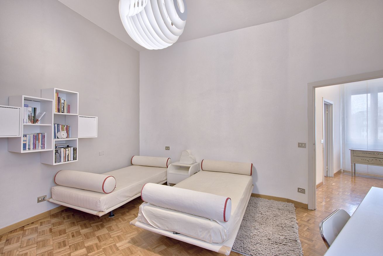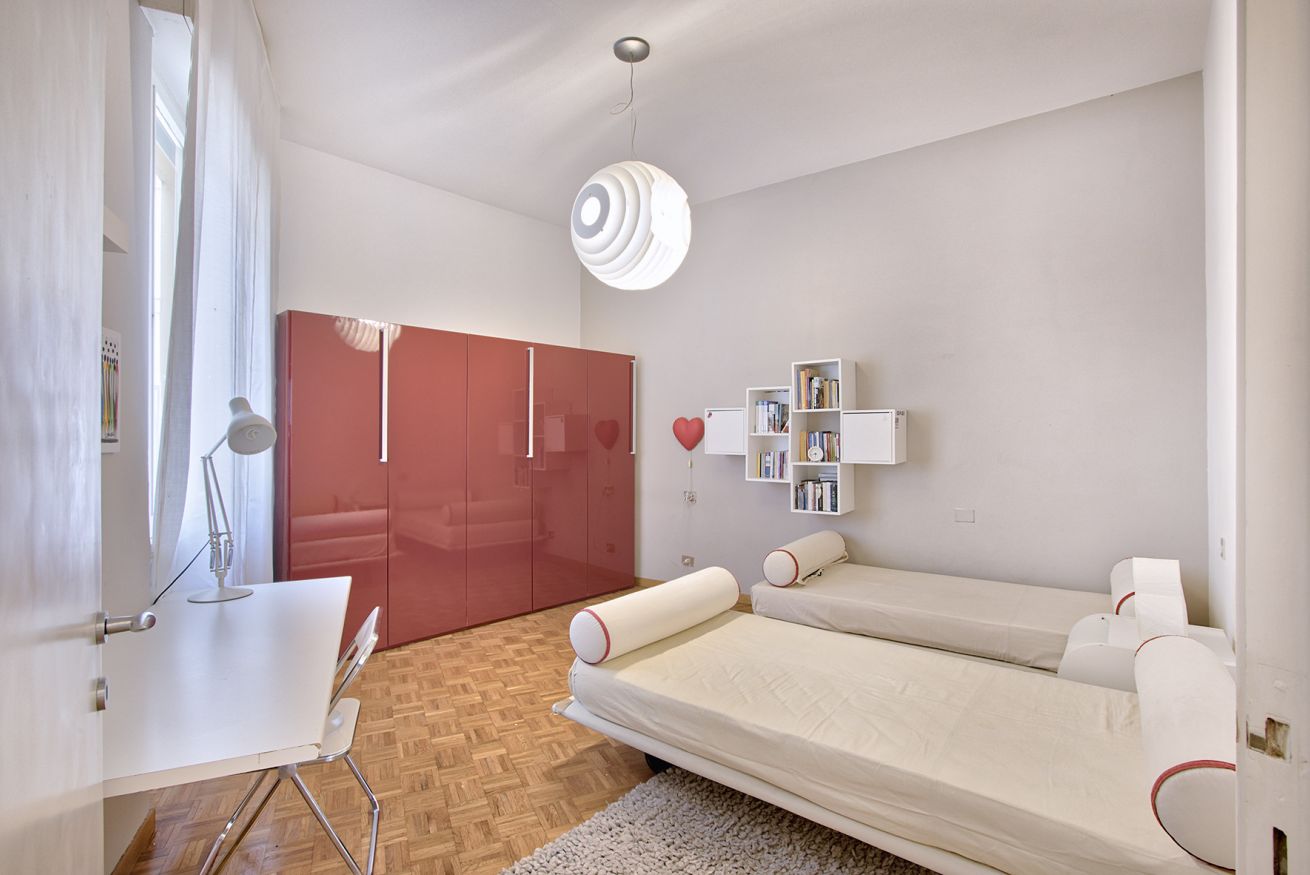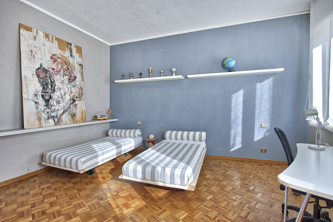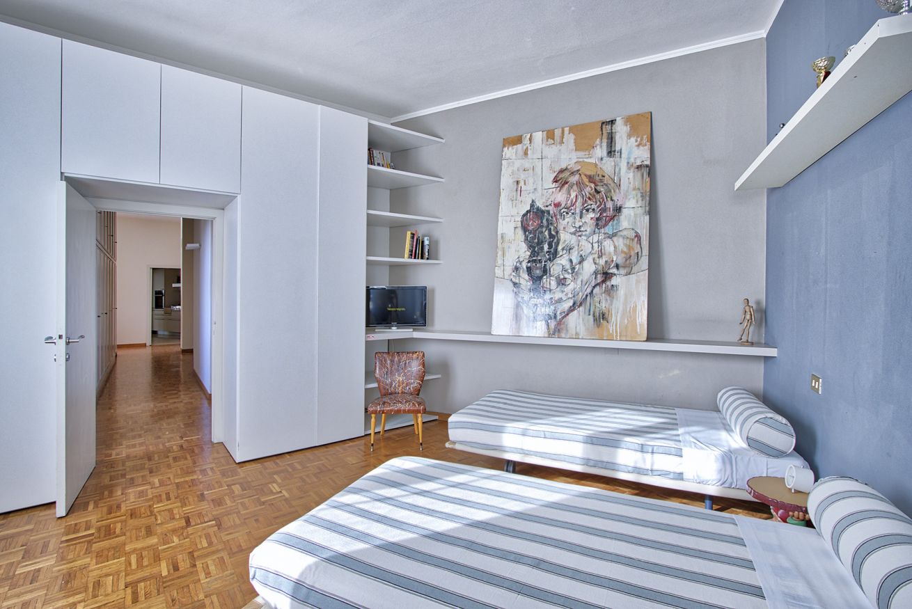 La zona notte offre tre camere da letto ampie e arredate con gusto. La camera padronale si distingue per la presenza di un elegante armadio spazioso e una raffinata chaise longue, elemento d’arredo che richiama lo charme classico. La seconda e la terza camera, entrambe dotate di capienti armadi, sono arredate con due letti singoli ciascuna; una delle due è completata da una TV, pensata per offrire un ulteriore angolo dedicato al relax.