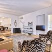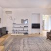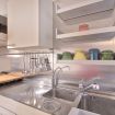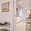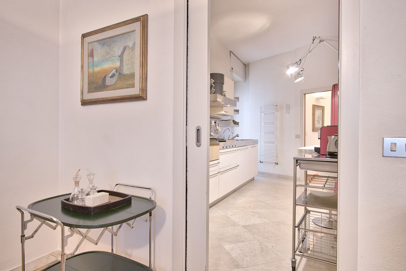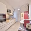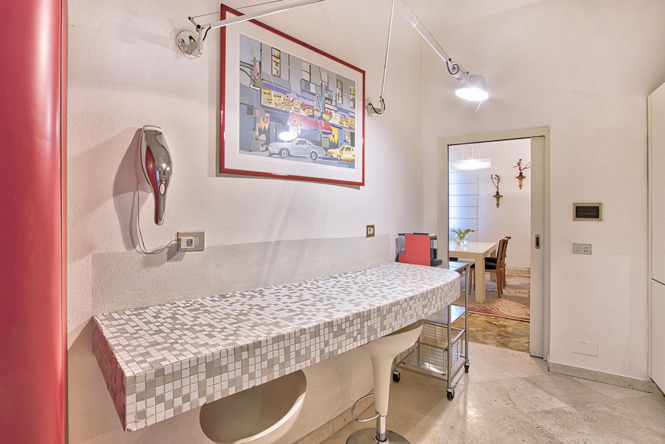 La cucina, moderna e lineare, è dotata di elettrodomestici di ultima generazione e arricchita da un raffinato piano snack rivestito in mosaico, accompagnato da sgabelli dal design contemporaneo: un dettaglio che unisce funzionalità e stile, rendendo questo spazio ideale sia per una colazione informale che per un momento conviviale.