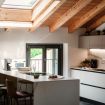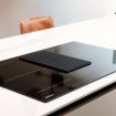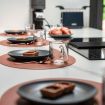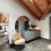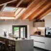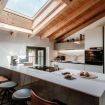 Al centro, l’isola cucina in granito pregiato è il vero protagonista: dotata di piano cottura moderno e cappa integrata, rifinita con sgabelli di design, è perfetta per aperitivi e colazioni live. Completano l’area una cucina lineare su misura, con elettrodomestici di fascia alta, funzionale e scenografica.