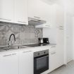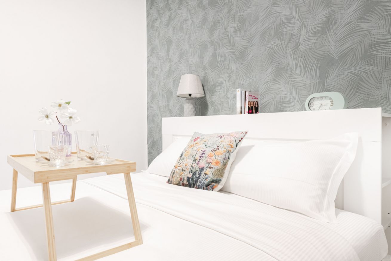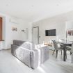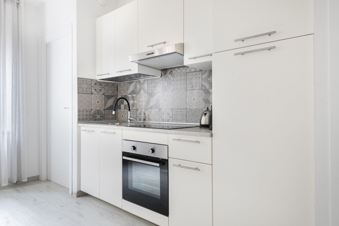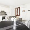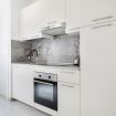 La zona living è accogliente e curata nei dettagli: un comodo divano letto che invita al relax davanti alla Smart TV, mentre il tavolo da pranzo, posizionato accanto alle grandi finestre, permette di cenare con una vista unica e scenografica. La cucina lineare, moderna e funzionale, è completa di elettrodomestici e valorizzata da un raffinato rivestimento decorativo che dona carattere e personalità all’ambiente.