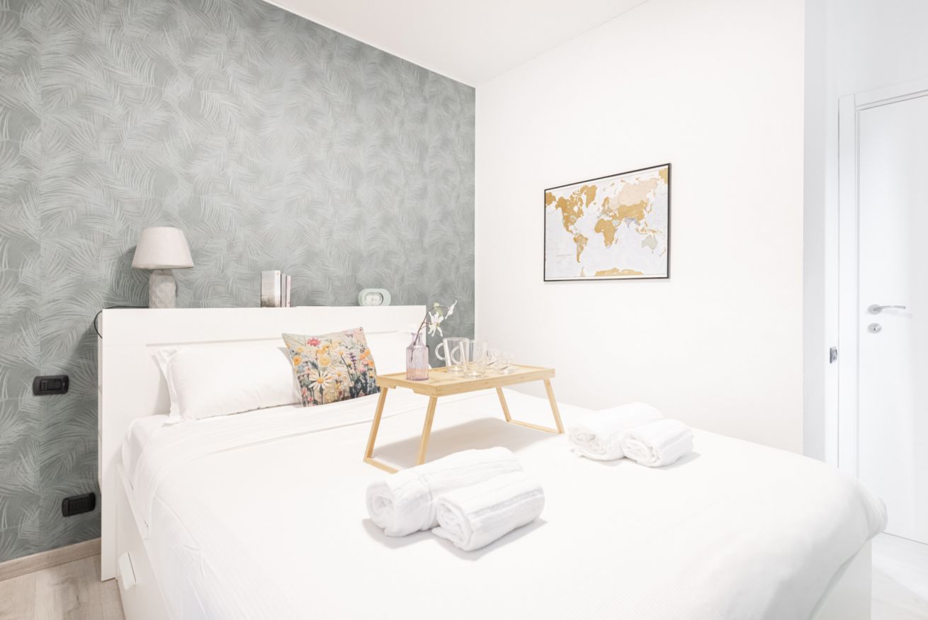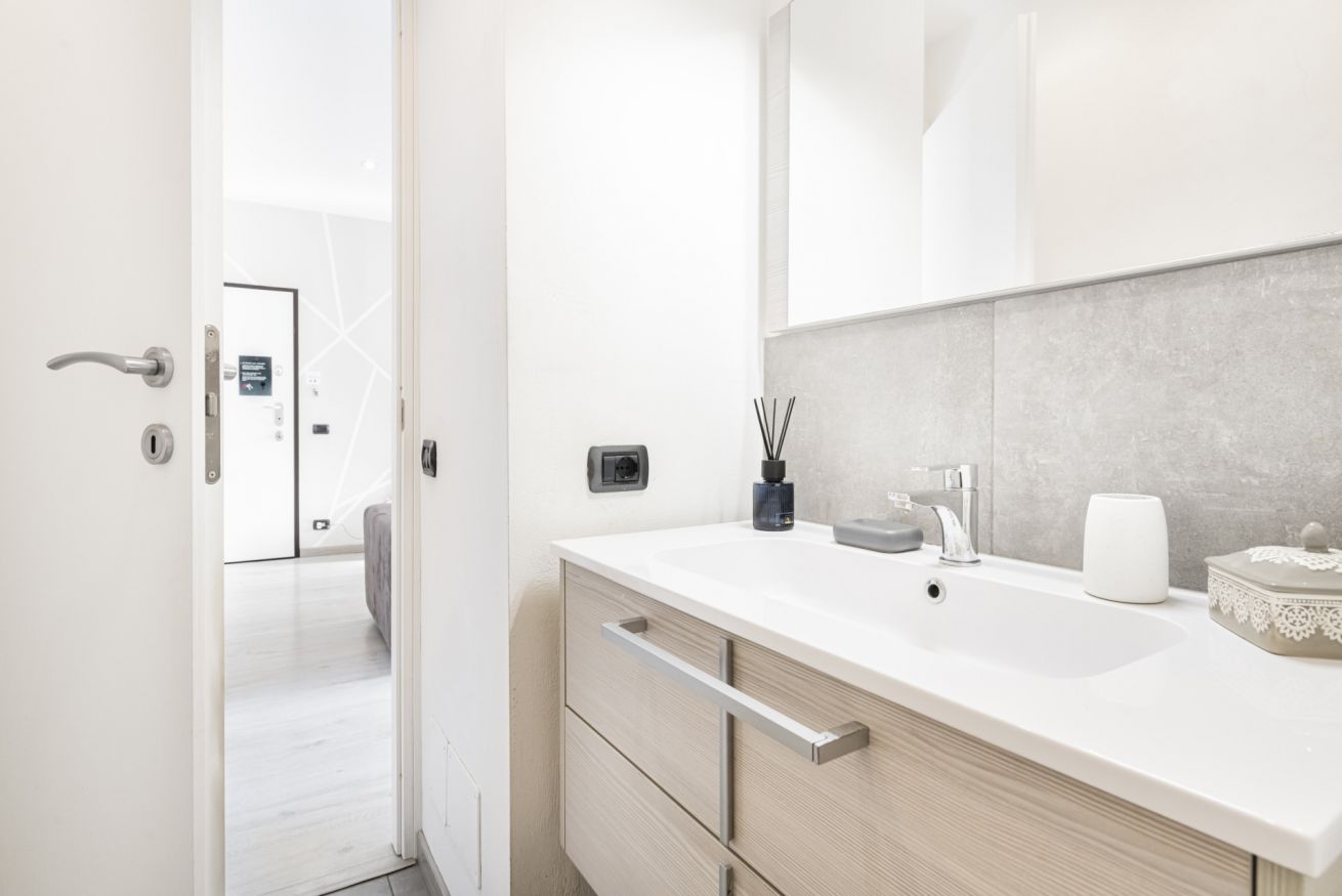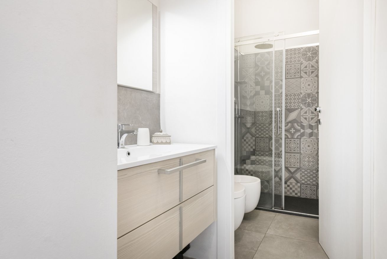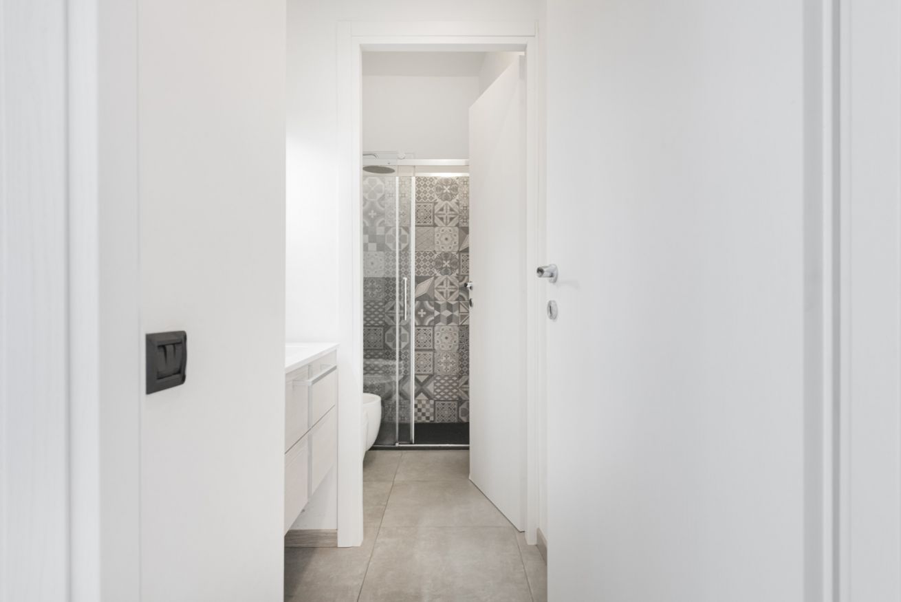 La camera matrimoniale, luminosa e armoniosa nei toni, offre un letto confortevole e ampi spazi contenitivi, creando un’oasi intima e rilassante. Il bagno, moderno e ben rifinito, è completo di doccia in vetro e arredi contemporanei.