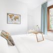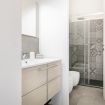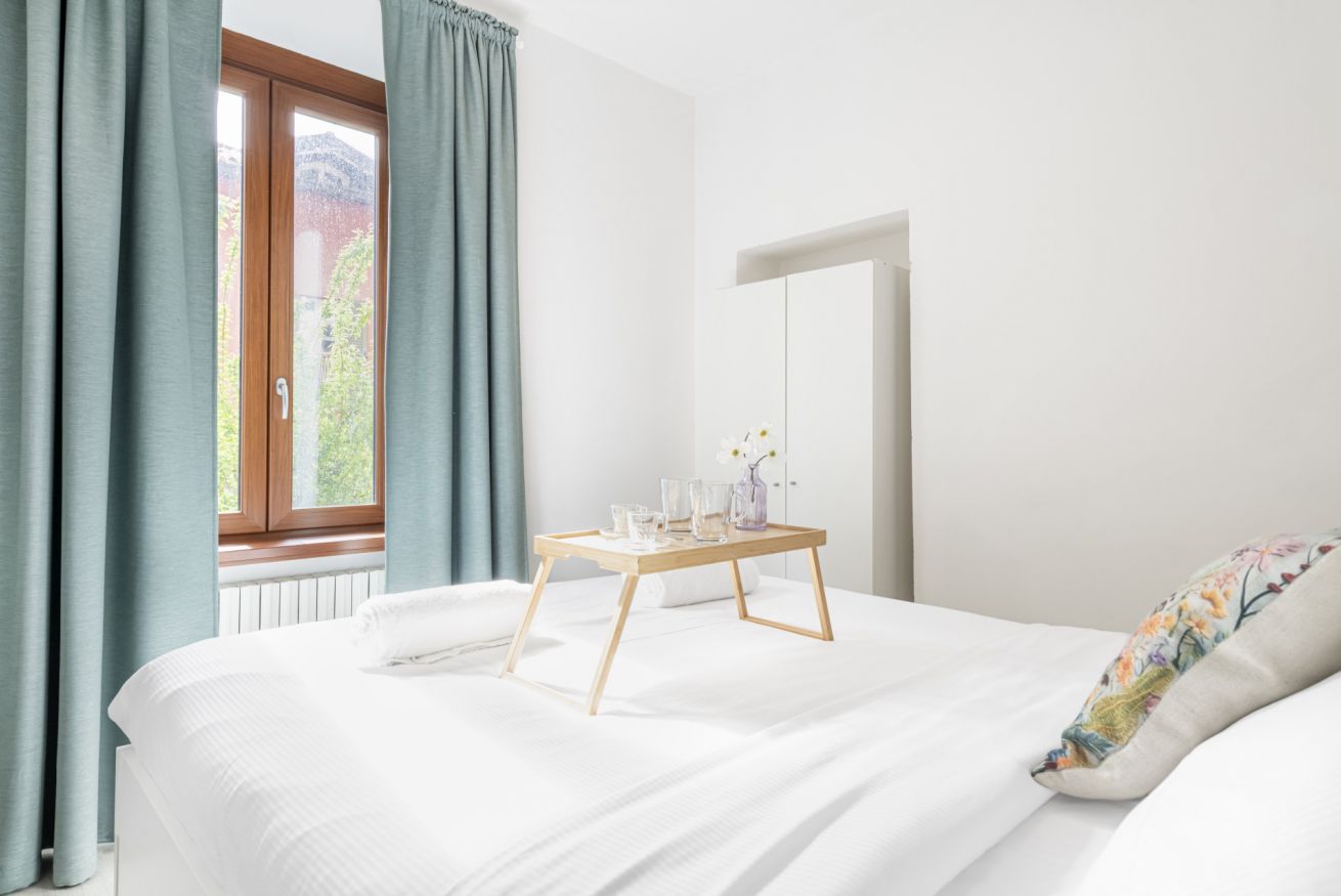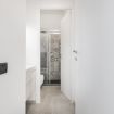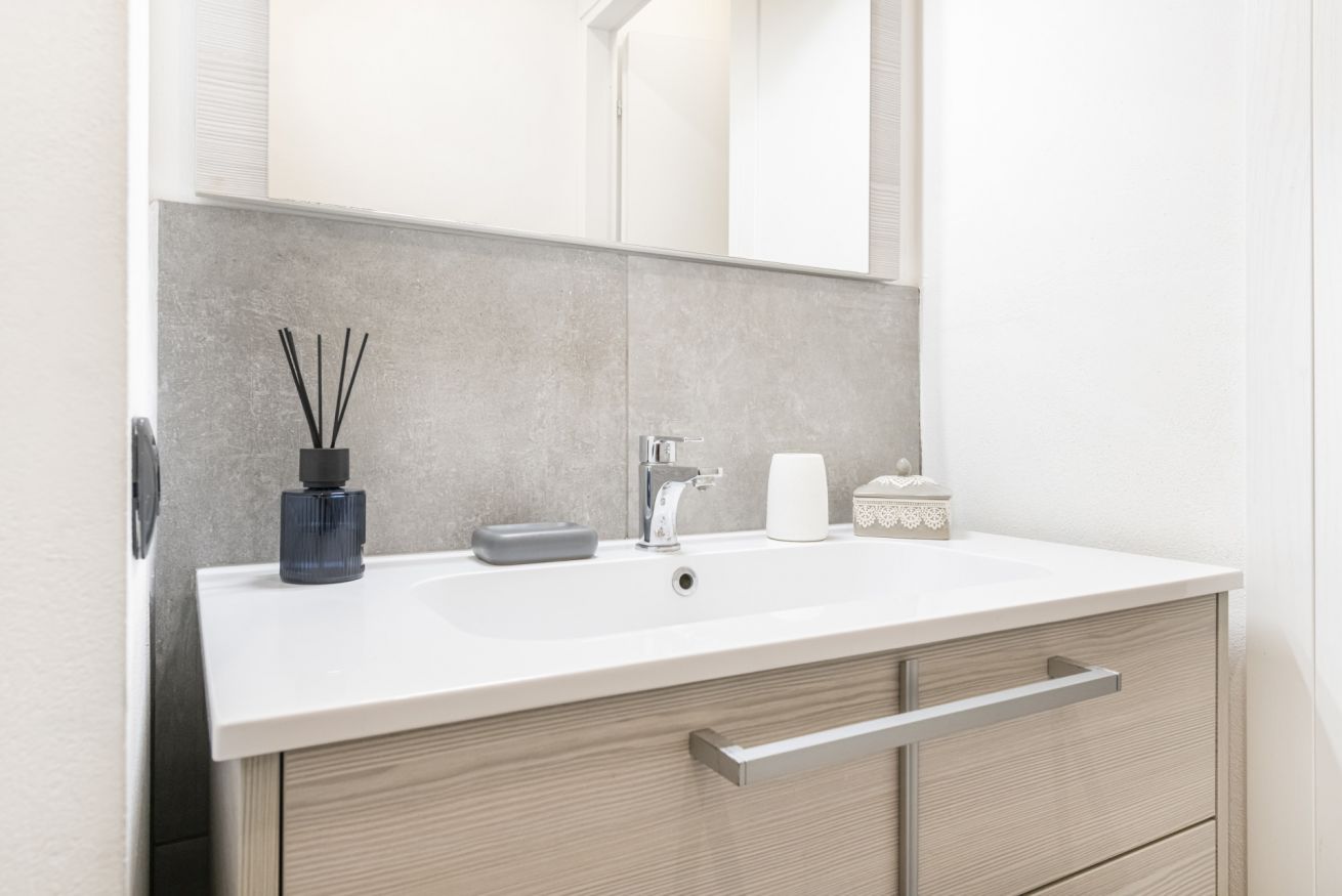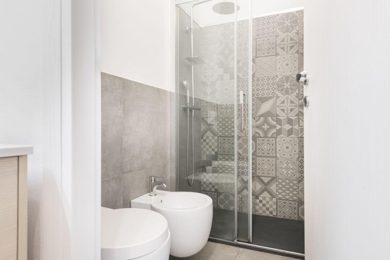 La camera matrimoniale, luminosa e armoniosa nei toni, offre un letto confortevole e ampi spazi contenitivi, creando un’oasi intima e rilassante. Il bagno, moderno e ben rifinito, è completo di doccia in vetro e arredi contemporanei.