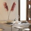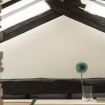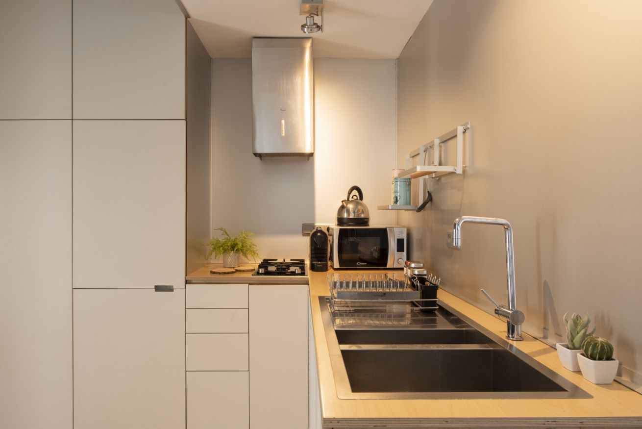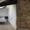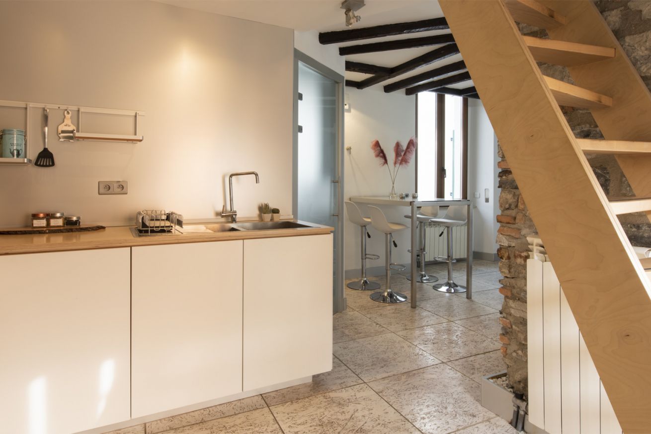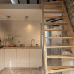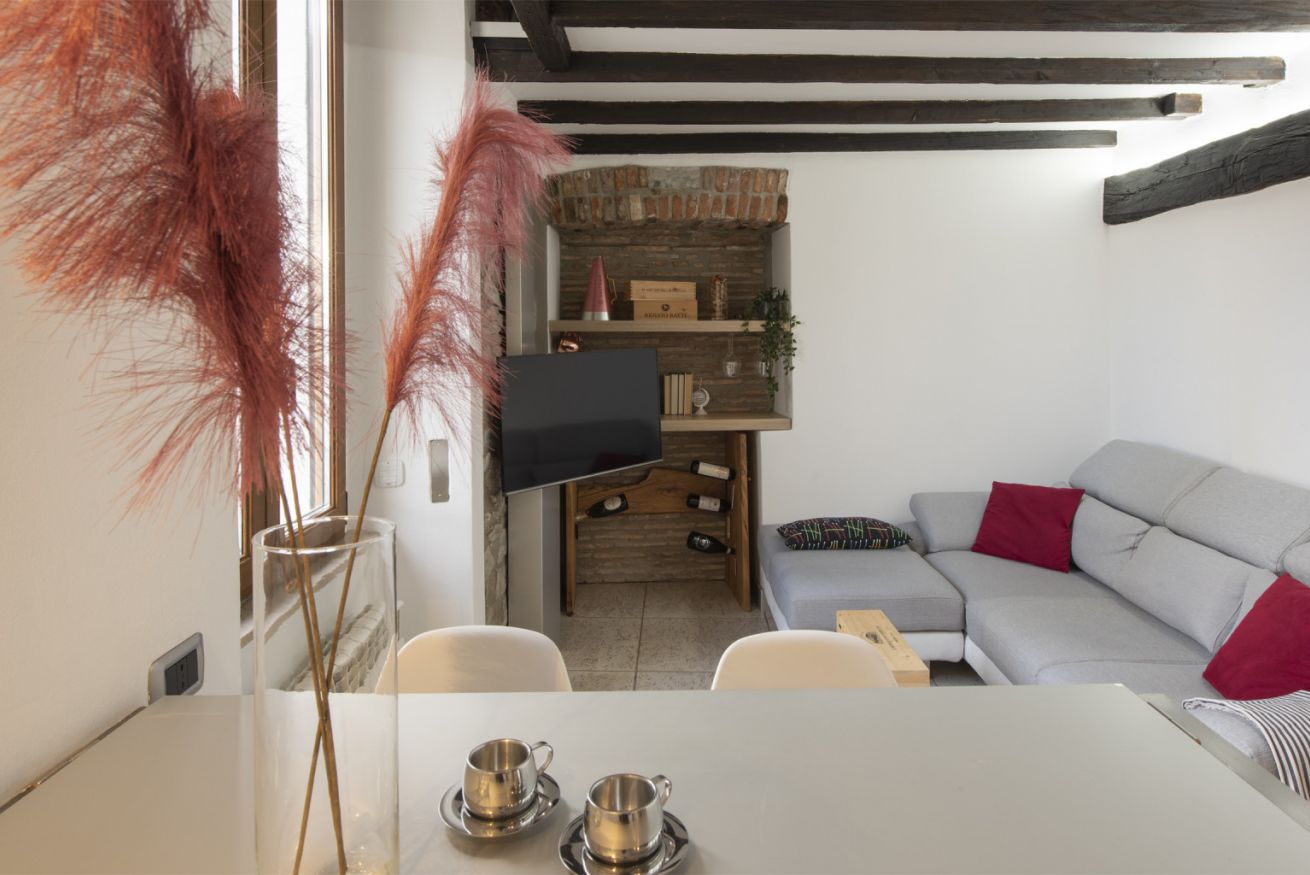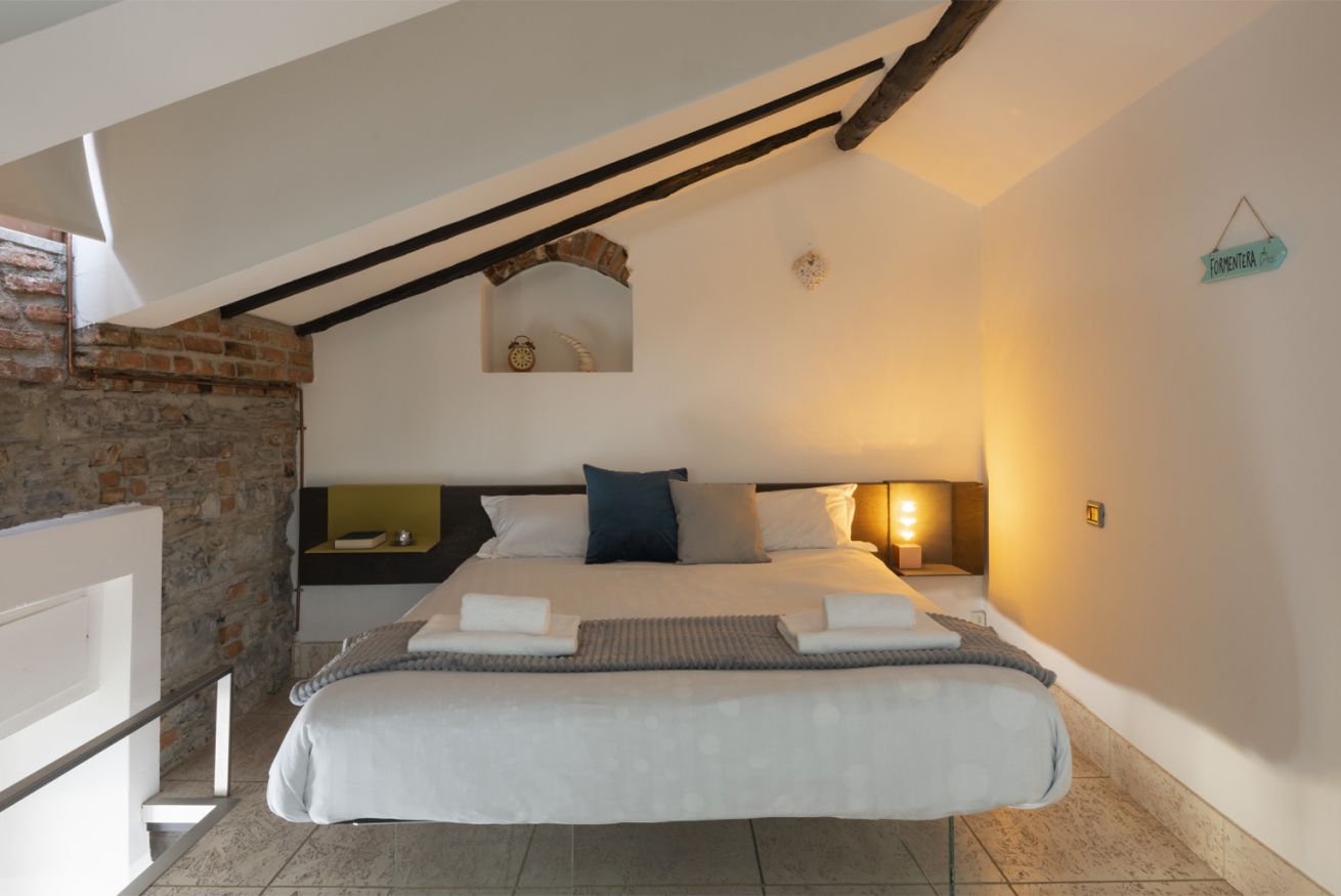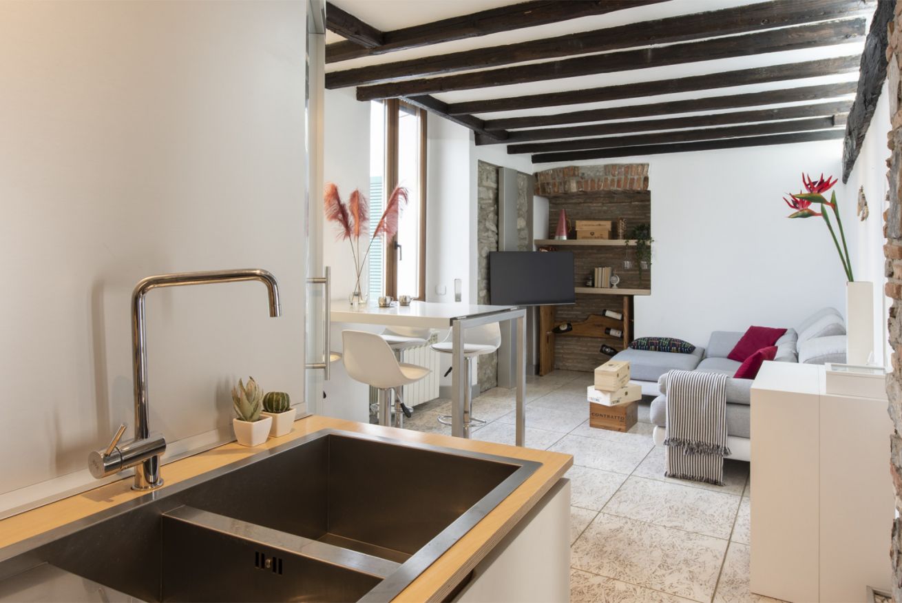 Al primo livello si sviluppa una zona living luminosa con comodo divano, Smart TV e parete attrezzata inserita in una nicchia in mattoni. Accanto, una zona pranzo dedicata con tavolo alto e sgabelli, perfetta per colazioni veloci o cene in compagnia, collegata alla cucina su misura dalle linee essenziali con top in legno naturale ed elettrodomestici moderni. La scala in legno dal design leggero conduce al livello superiore, dove la camera matrimoniale, raccolta sotto le travi, regala un ambiente intimo e rilassante.
