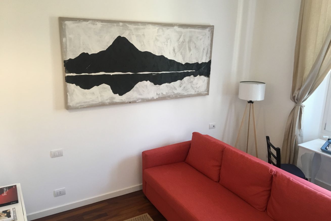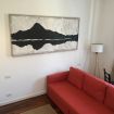 La zona living colpisce per l’elegante divano letto rosso che diventa protagonista dello spazio, affiancato da una TV su mobile minimal e impreziosito da opere d’arte moderne che donano personalità e stile. Un angolo relax con poltrone di design e lampada scenografica crea un’atmosfera intima e sofisticata.