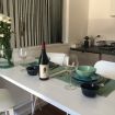 La cucina lineare, essenziale e funzionale, è illuminata da luce calda e completata da un tavolo alto con sgabelli bianchi, perfetto per colazioni conviviali o cene informali.