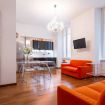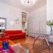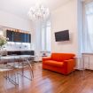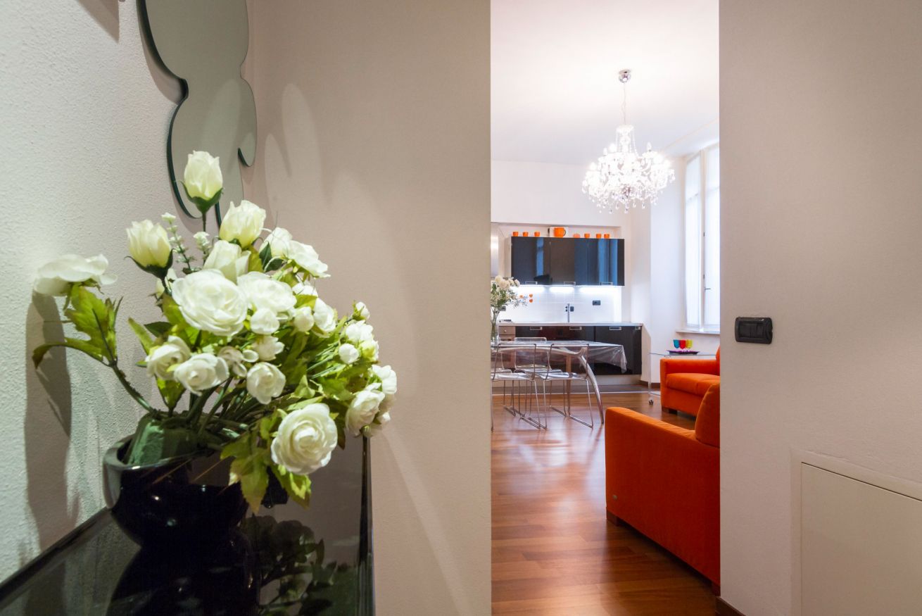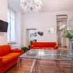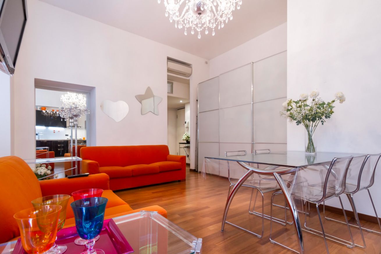 Elegante e sofisticato appartamento al secondo piano con ascensore, climatizzato e progettato per offrire un’esperienza abitativa di assoluto comfort e stile. Gli spazi si sviluppano in un ampio open space arioso e perfettamente bilanciato, dove la luce naturale, amplificata dalle grandi finestre, esalta il calore del parquet e la fluidità degli ambienti. La zona living si distingue per il raffinato contrasto tra tonalità neutre e accenti vivaci: il divano letto arancio diventa protagonista scenografico, affiancato da arredi in vetro e linee leggere che donano leggerezza e continuità visiva.