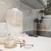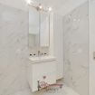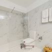Il bagno, un vero e proprio rifugio di lusso, è rivestito di marmo bianco e dotato di sanitari e mobili dal design moderno e sinuoso, con una doccia XXL per esperienze di puro benessere.