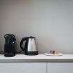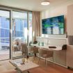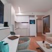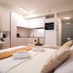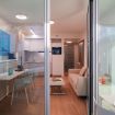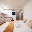 L’ingresso accoglie con un meraviglioso open space progettato nei minimi dettagli. La zona living offre un comodo divano letto matrimoniale, affiancato da una grande smart TV a parete, ideale per momenti di relax