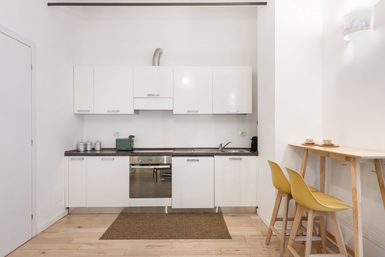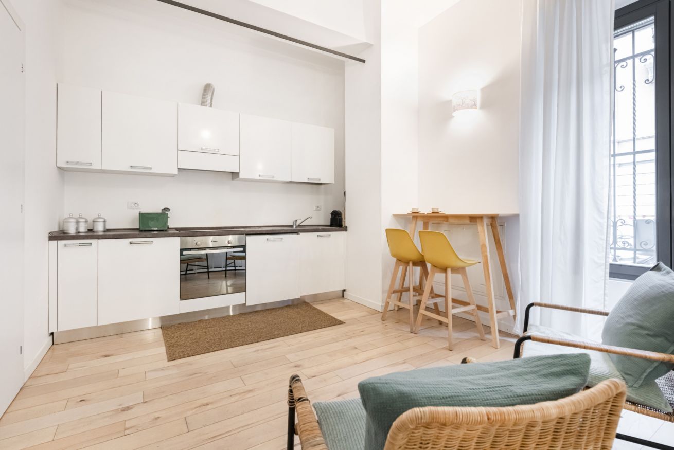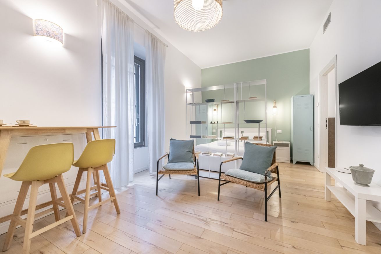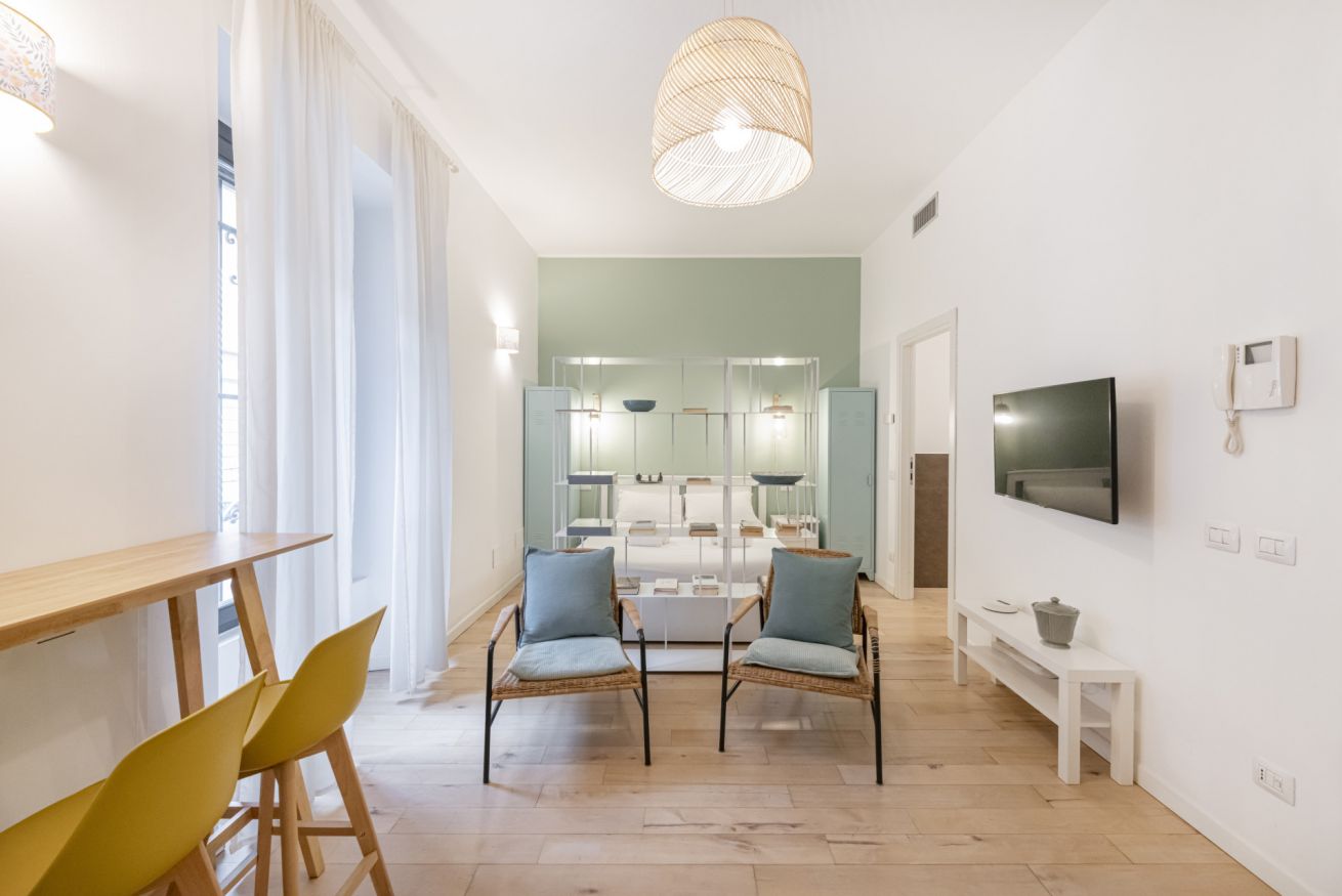 Il soggiorno accoglie una confortevole area relax con due poltrone imbottite, Smart TV a parete e dettagli d’arredo ricercati, perfetti per momenti di riposo dopo una giornata in città. La cucina lineare, moderna e ben organizzata, è completa di elettrodomestici e superfici funzionali; adiacente si trova un pratico breakfast table in legno con sgabelli, ideale per colazioni, pasti veloci o smart working. Il bagno, elegante e contemporaneo, è rifinito con materiali neutri e dispone di una spaziosa doccia walk-in in vetro, sanitari sospesi e mobile lavabo con contenitore. Un monolocale accogliente, luminoso e studiato nei minimi dettagli, perfetto per soggiorni di lavoro o piacere.
