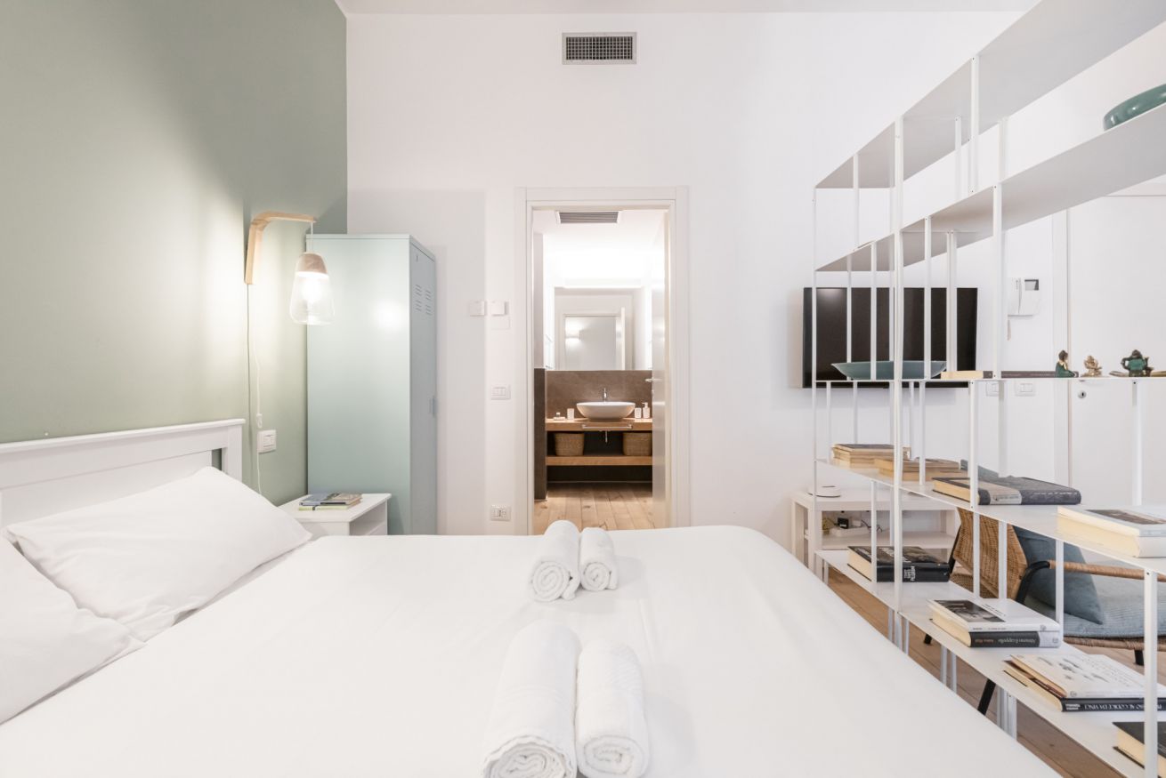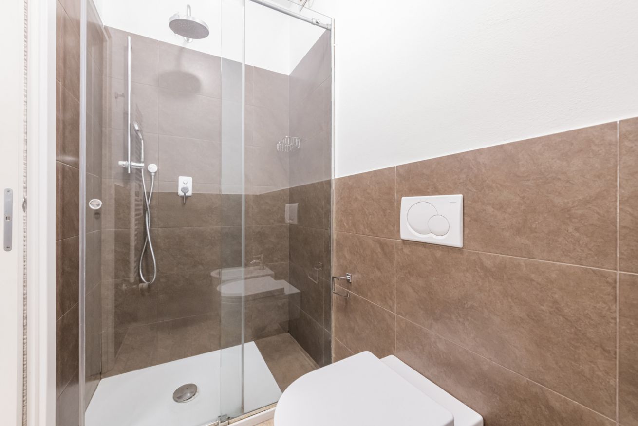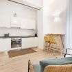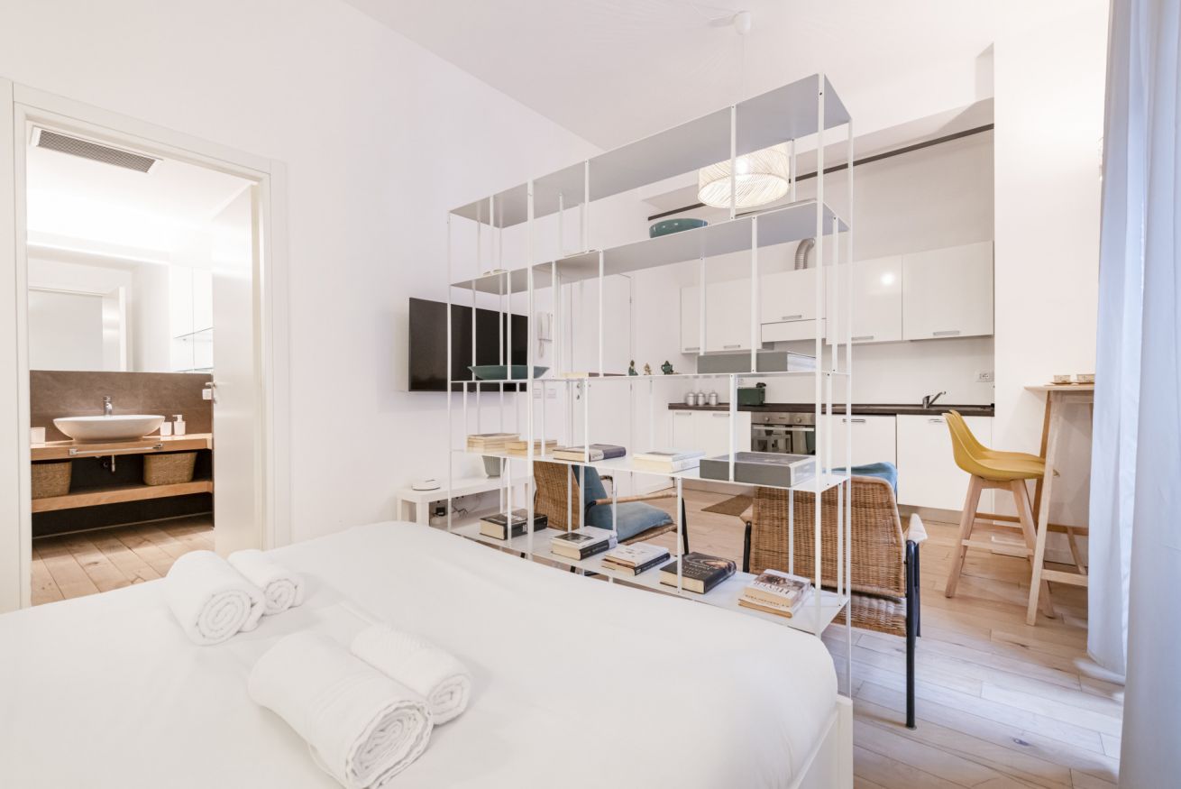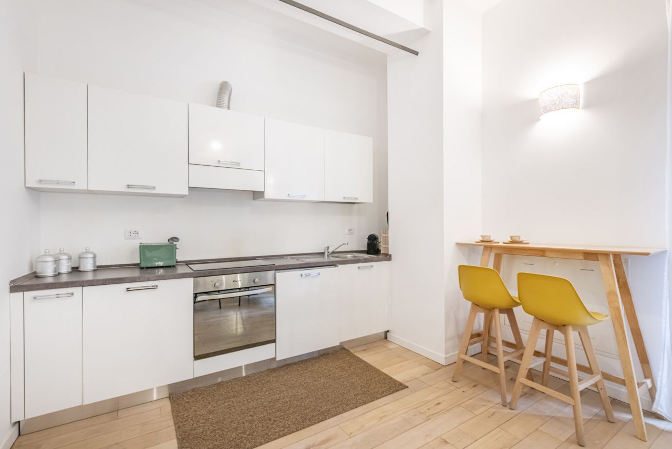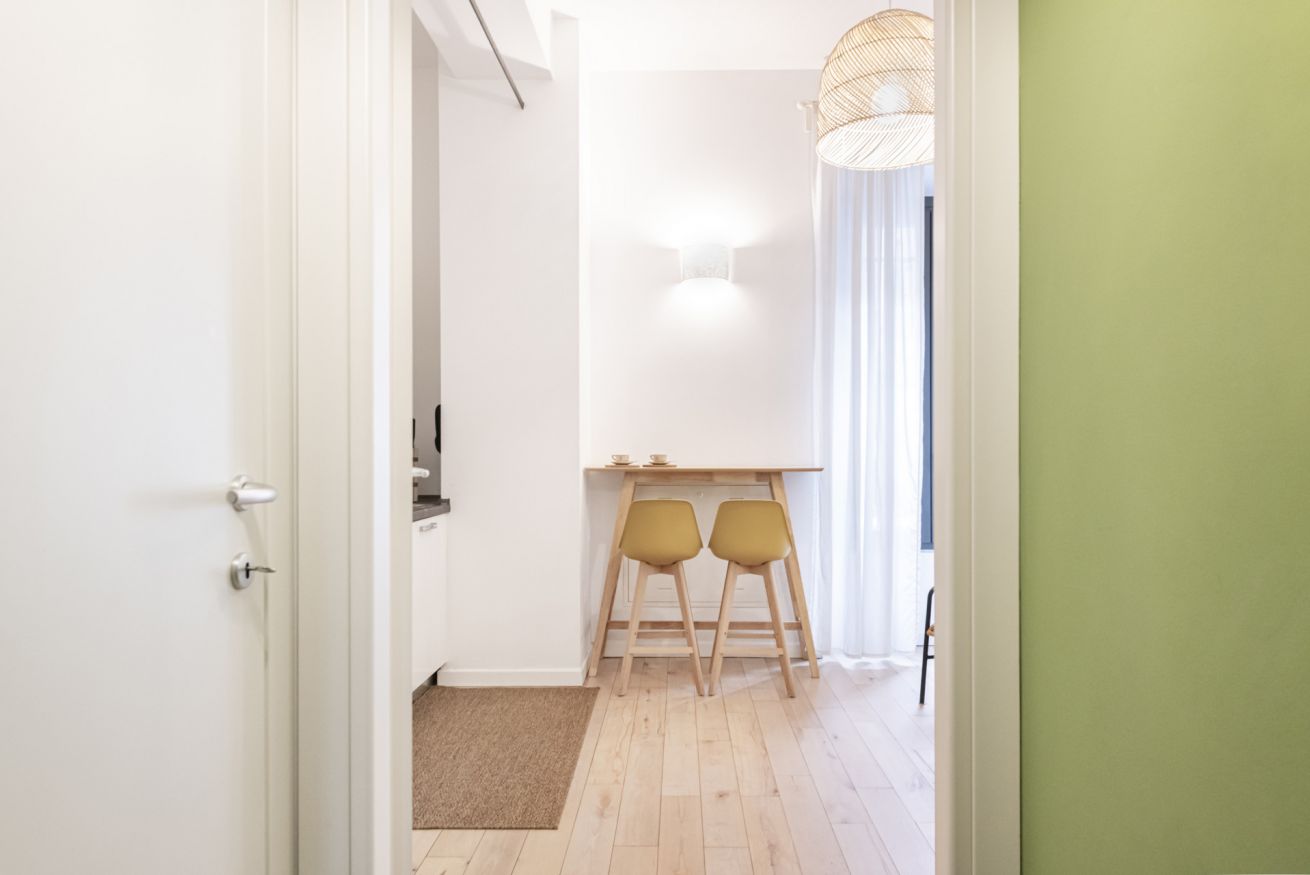 Il soggiorno accoglie una confortevole area relax con due poltrone imbottite, Smart TV a parete e dettagli d’arredo ricercati, perfetti per momenti di riposo dopo una giornata in città. La cucina lineare, moderna e ben organizzata, è completa di elettrodomestici e superfici funzionali; adiacente si trova un pratico breakfast table in legno con sgabelli, ideale per colazioni, pasti veloci o smart working. Il bagno, elegante e contemporaneo, è rifinito con materiali neutri e dispone di una spaziosa doccia walk-in in vetro, sanitari sospesi e mobile lavabo con contenitore. Un monolocale accogliente, luminoso e studiato nei minimi dettagli, perfetto per soggiorni di lavoro o piacere.