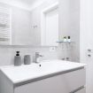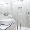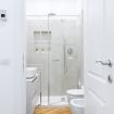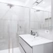 Completa l'appartamento la presenza di due bagni moderni, entrambi con spaziose docce in vetro, rifinite con materiali di alta qualità che aggiungono un tocco di eleganza e funzionalità.