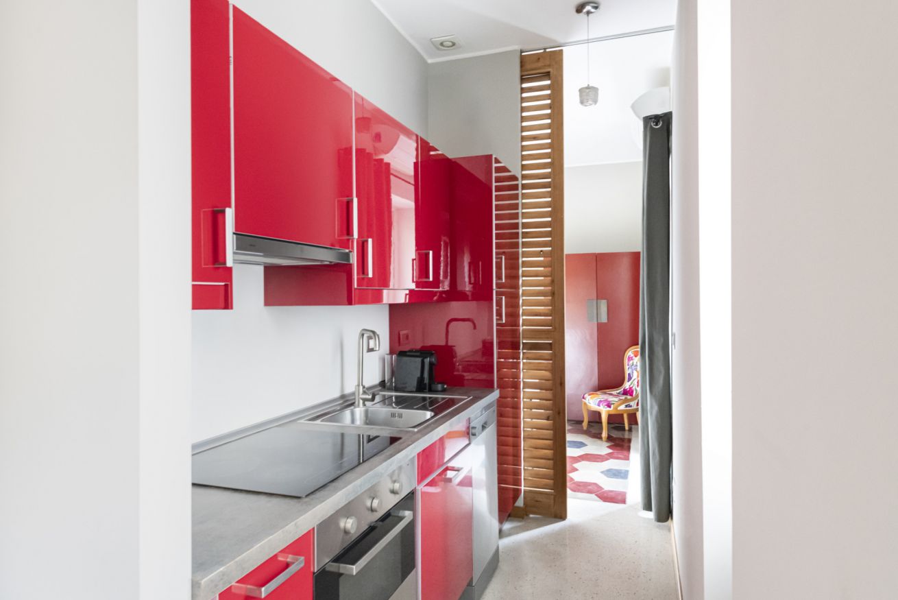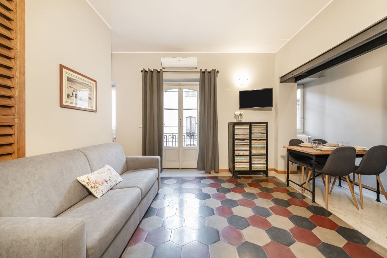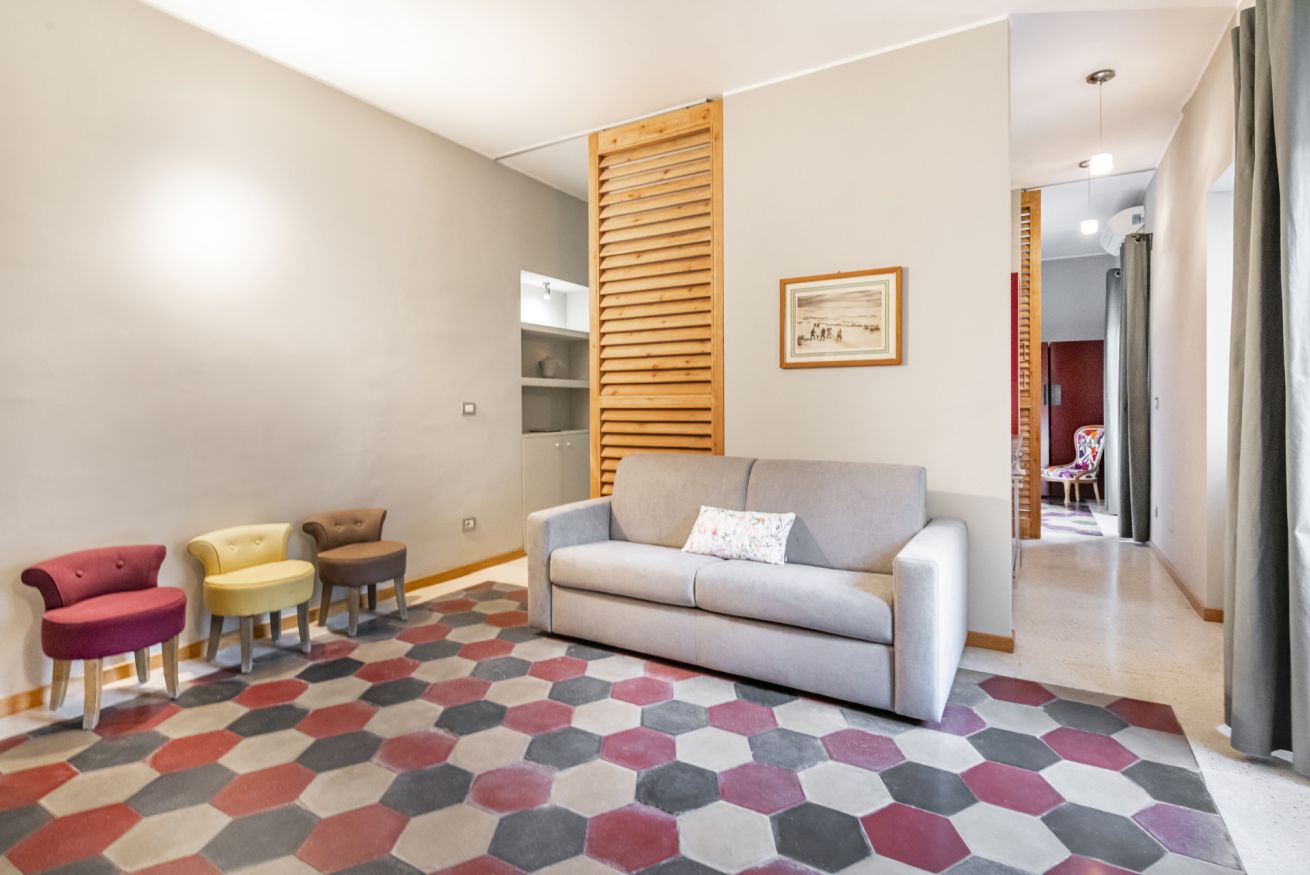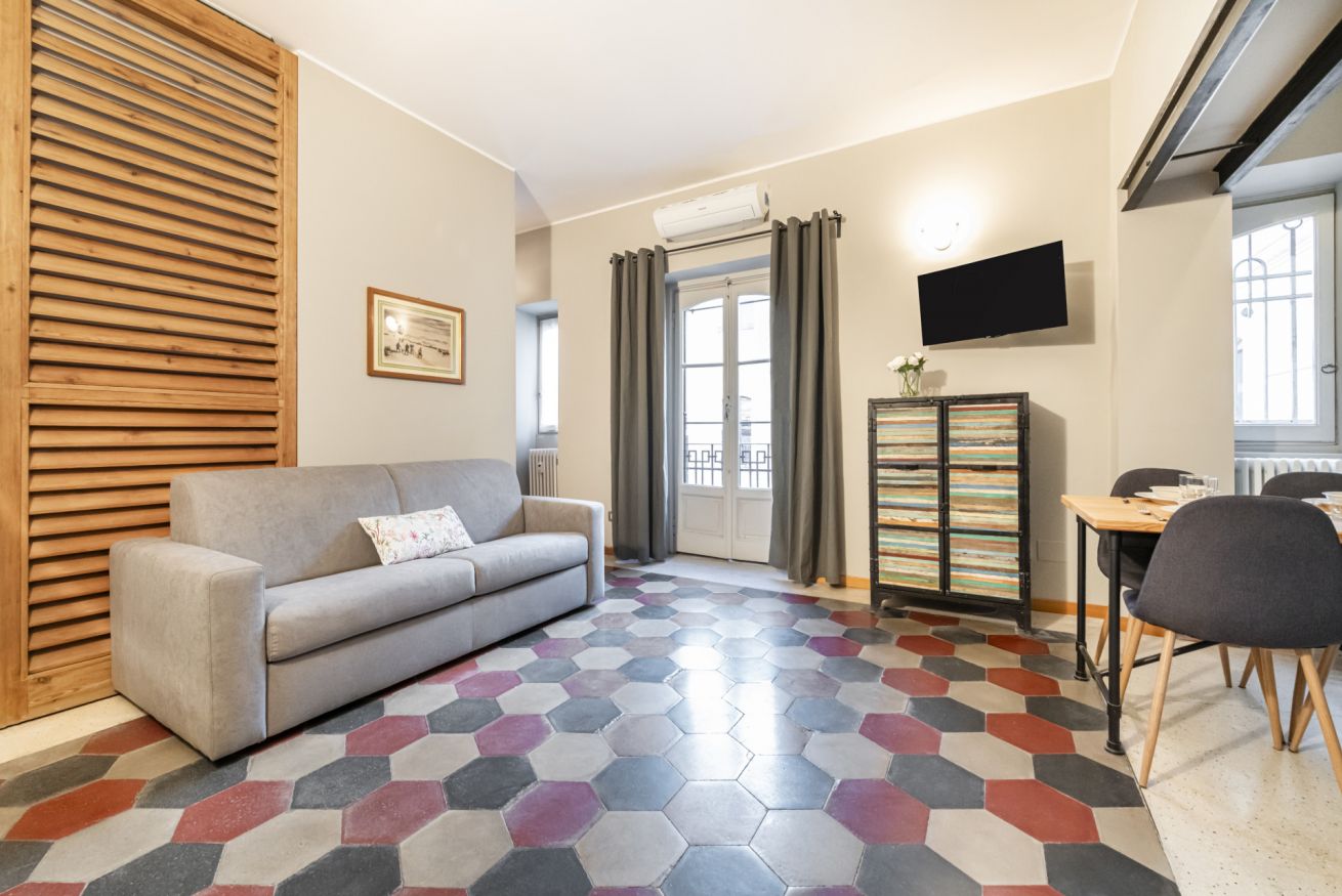 Al 4° piano di un elegante stabile con ascensore e servizio di portineria, questo nuovo appartamento climatizzato conquista al primo sguardo per il suo carattere deciso e contemporaneo. L’ingresso introduce a un soggiorno luminoso impreziosito dallo scenografico pavimento esagonale dalle tonalità grigio, rosso e antracite, che dialoga con arredi ricercati e dettagli di design. Il comodo divano letto e la Smart TV creano un perfetto angolo relax, mentre le ampie porte finestre donano luce naturale e accesso al balcone.