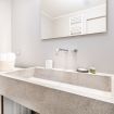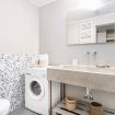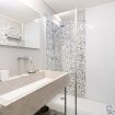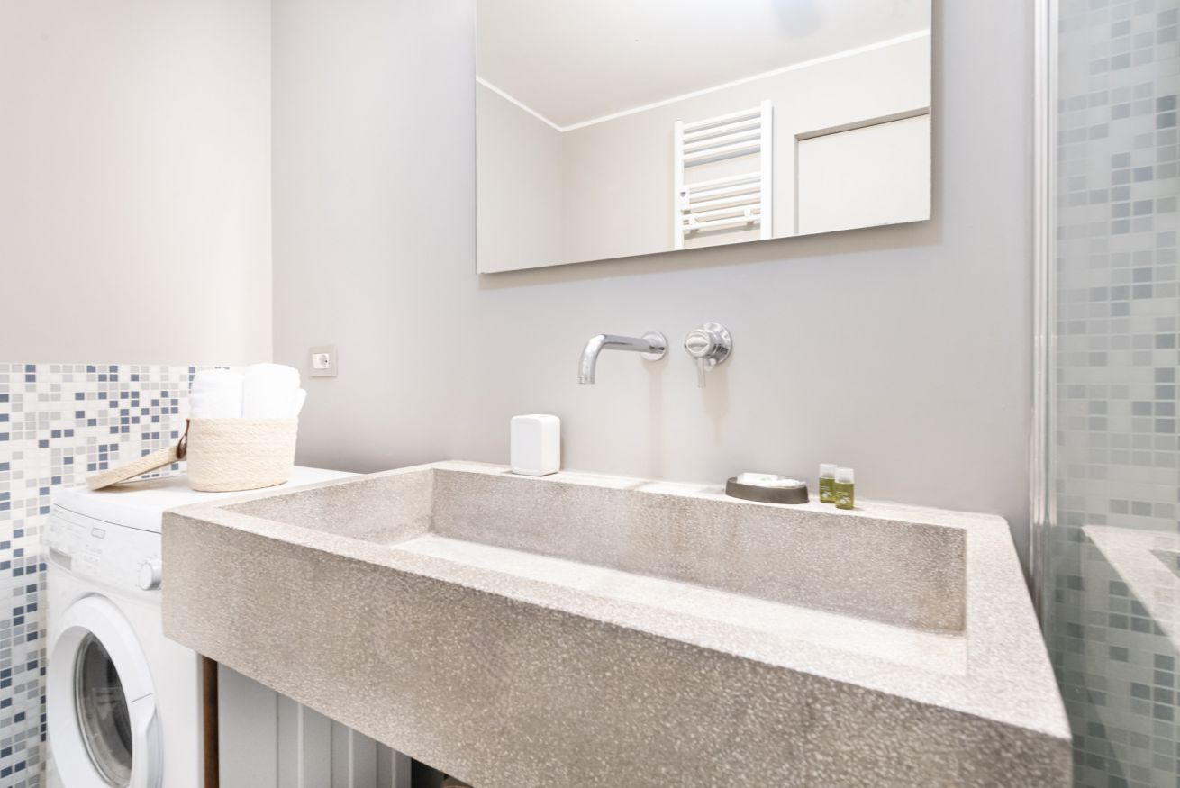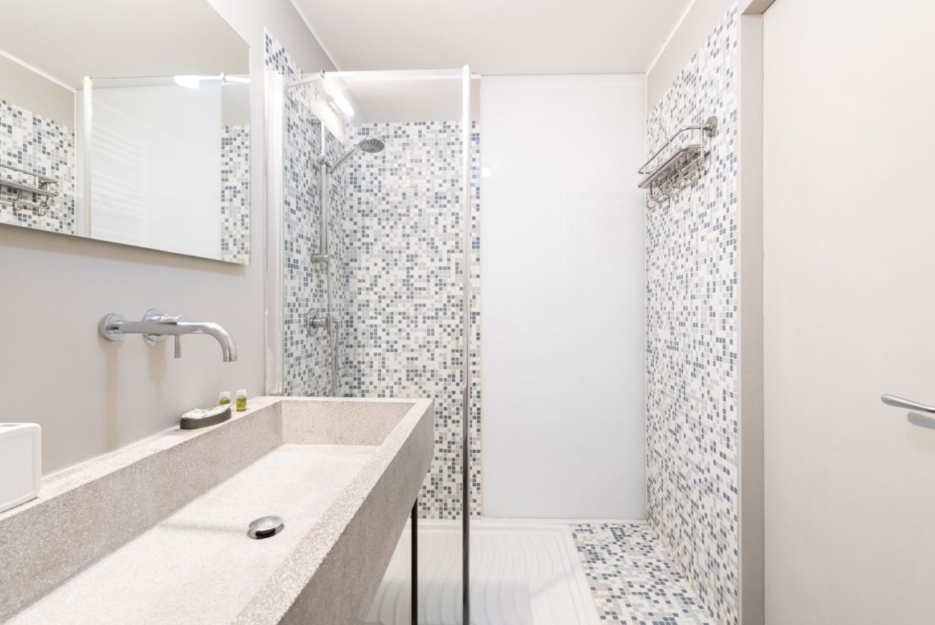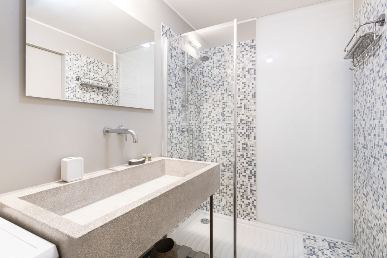Il bagno, elegante e curato nei dettagli, è dotato di ampia doccia walk-in con rivestimento in mosaico, lavabo dal design contemporaneo e spazi ben organizzati.