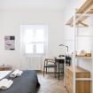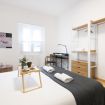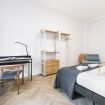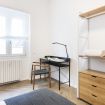 La camera da letto è un’oasi di tranquillità, dove ogni elemento è pensato per il tuo benessere. Il letto matrimoniale, con lenzuola fresche e cuscini soffici, è affiancato da una zona studio con scrivania e sedia di design: perfetto per chi viaggia per lavoro o ha bisogno di uno spazio tranquillo per concentrarsi. L’armadio aperto con cassetti in legno e appendiabiti offre ampio spazio per sistemare al meglio il proprio guardaroba.
