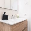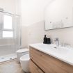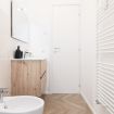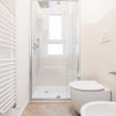 Il bagno è moderno, essenziale ma raffinato, dotato di ampia doccia con soffione a pioggia, sanitari sospesi e asciugamani morbidi. La lavasciuga, perfettamente integrata nello spazio, completa l’offerta e rende l’appartamento perfetto anche per soggiorni più lunghi.