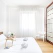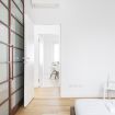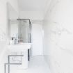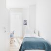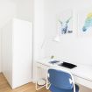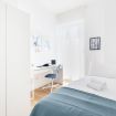 La camera singola, pensata per garantire privacy e concentrazione, è dotata di una scrivania, un armadio per le necessità di organizzazione e un balcone che offre una fuga privata all'esterno. Il bagno si distingue per l'eleganza del marmo bianco, una spaziosa doccia in vetro e la praticità di una lavasciuga, assicurando funzionalità e lusso. Completa la disposizione dell'appartamento una camera matrimoniale con un ampio armadio, progettata per offrire un rifugio sereno e spazioso, ideale per il riposo notturno.