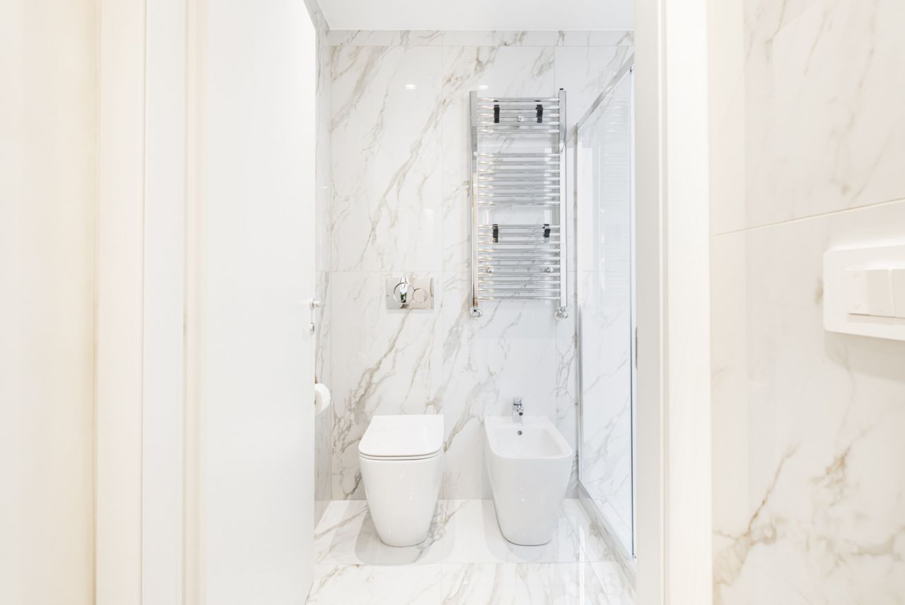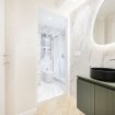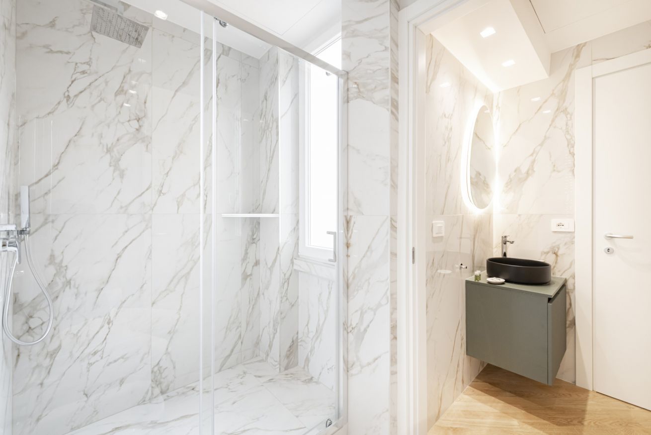 Il bagno, rivestito in marmo chiaro, ospita una spaziosa doccia walk-in e sanitari moderni cromati, chiuso con porte vetro destinate a un comfort quotidiano raffinato.