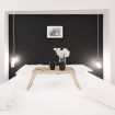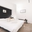 Nuovo appartamento in Corso Garibaldi 44, Milano, offre un soggiorno luminoso con ampie finestre, divano letto angolare, Smart TV, e una cucina bianca laccata con penisola in acciaio. Comprende una camera con letti singoli, bagno con doccia spaziosa, e una matrimoniale con grande armadio. Eleganza in bianco e nero.