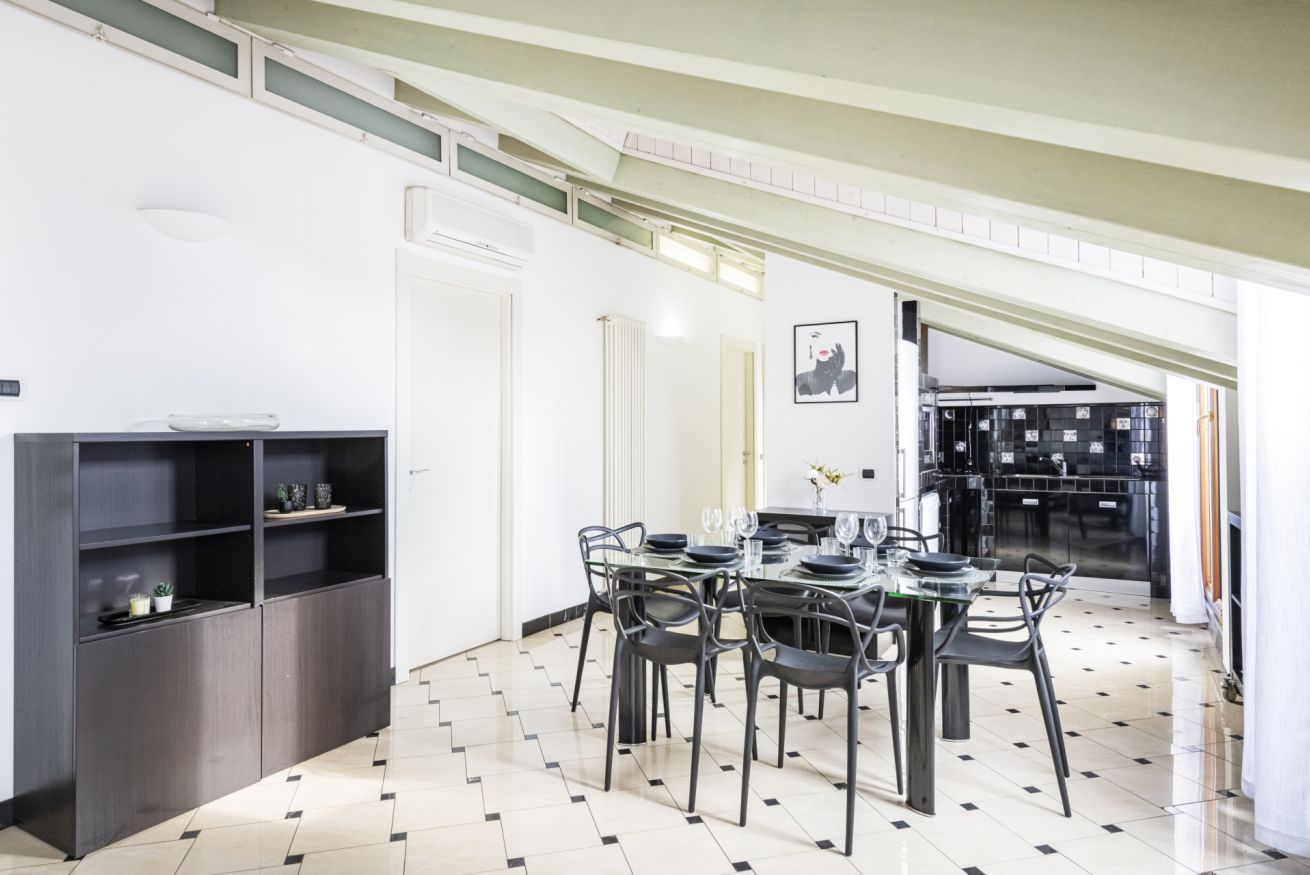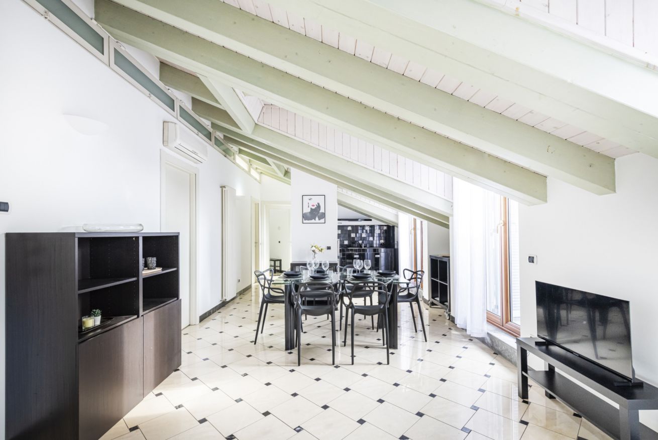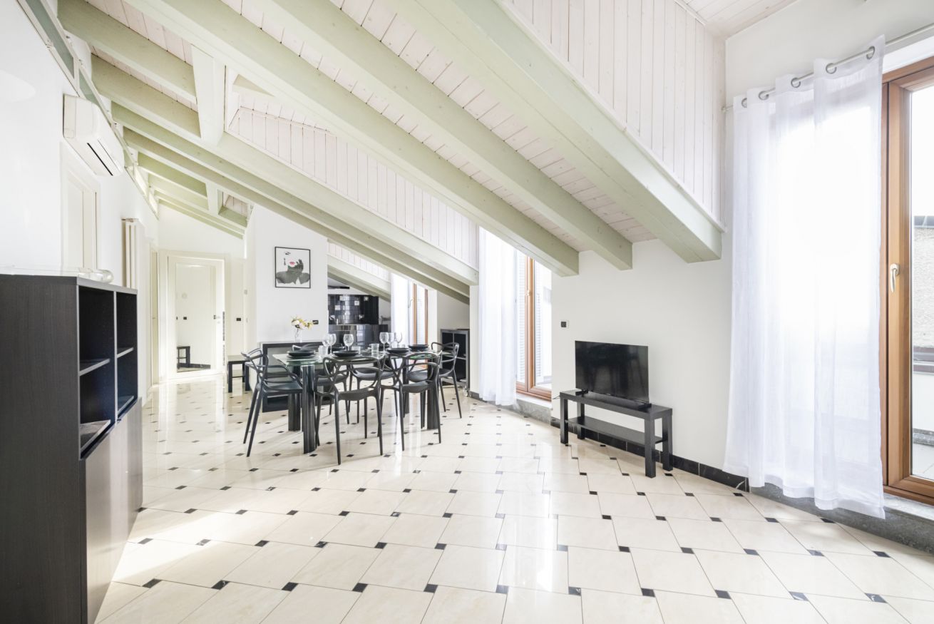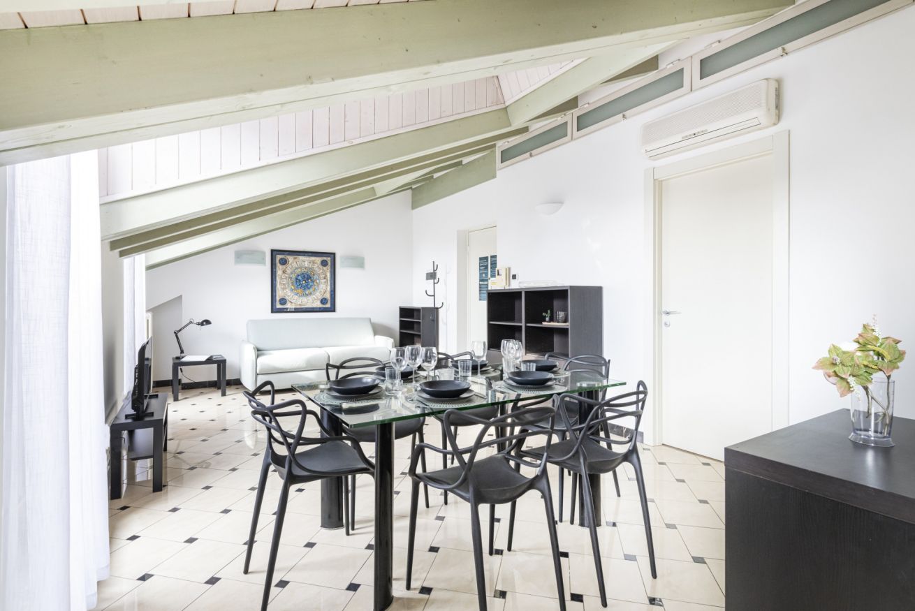 L’ingresso conduce a una spaziosa zona living, caratterizzata da soffitti mansardati, pavimenti in ceramica chiara e grandi portefinestre che inondano l’ambiente di luce naturale. Il soggiorno ospita un comodo divano letto, Smart TV e una raffinata zona pranzo con tavolo in vetro e sedute di design, perfettamente integrata nello spazio.