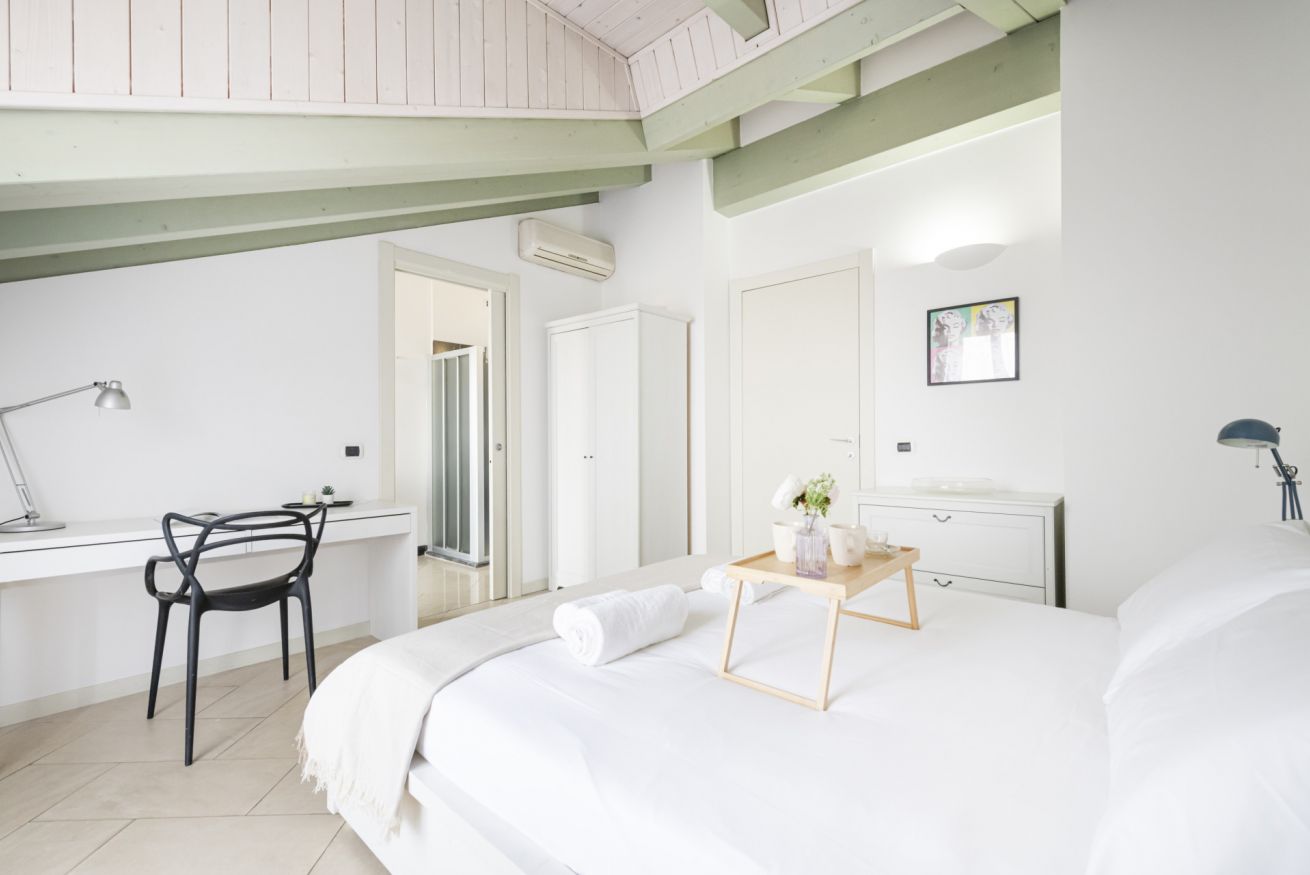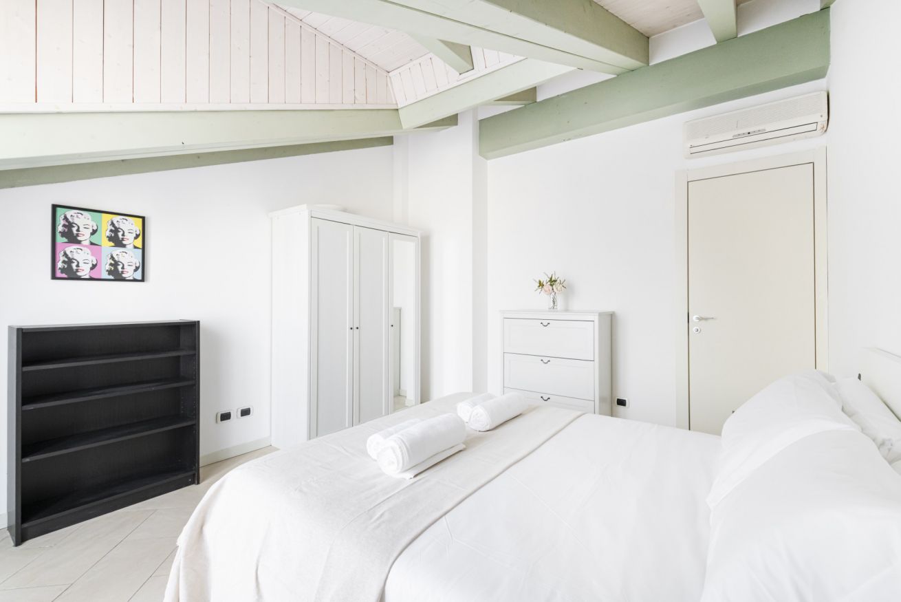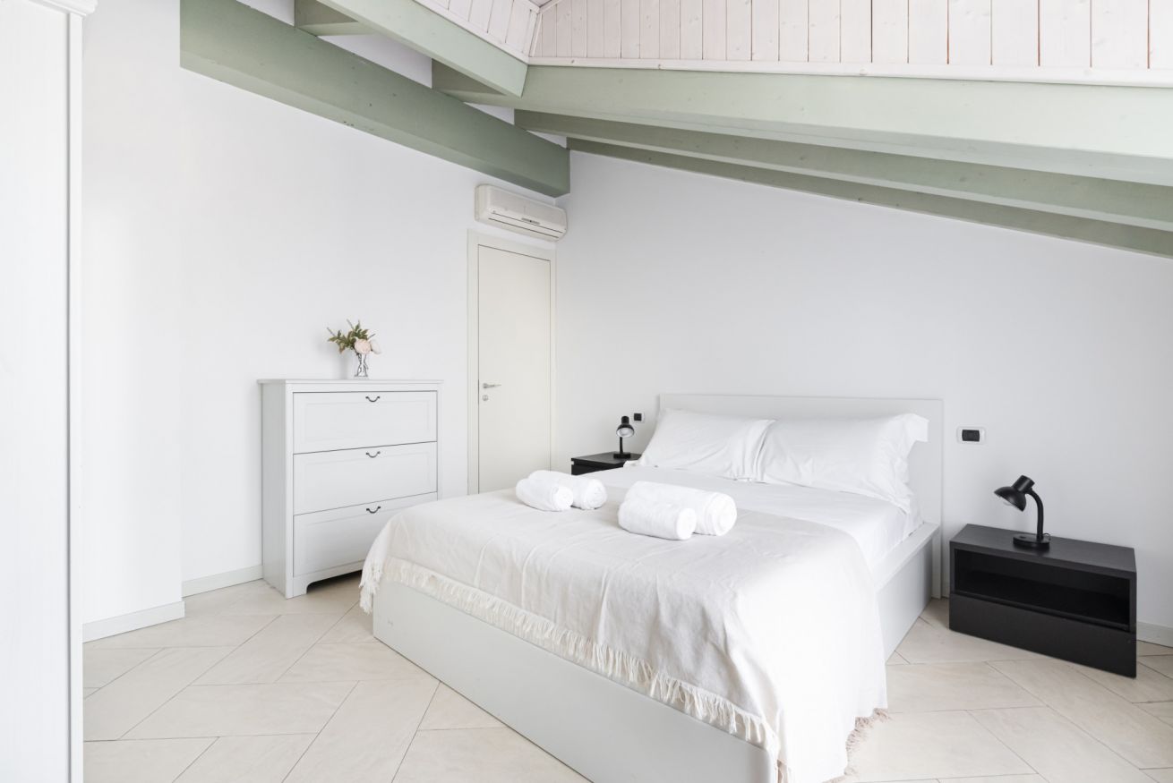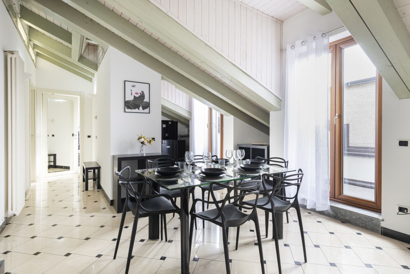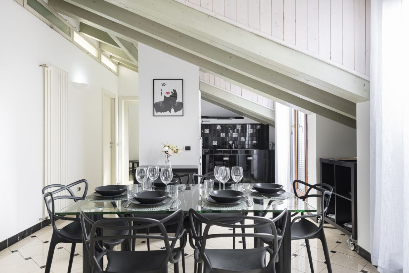 L’ingresso conduce a una spaziosa zona living, caratterizzata da soffitti mansardati, pavimenti in ceramica chiara e grandi portefinestre che inondano l’ambiente di luce naturale. Il soggiorno ospita un comodo divano letto, Smart TV e una raffinata zona pranzo con tavolo in vetro e sedute di design, perfettamente integrata nello spazio.