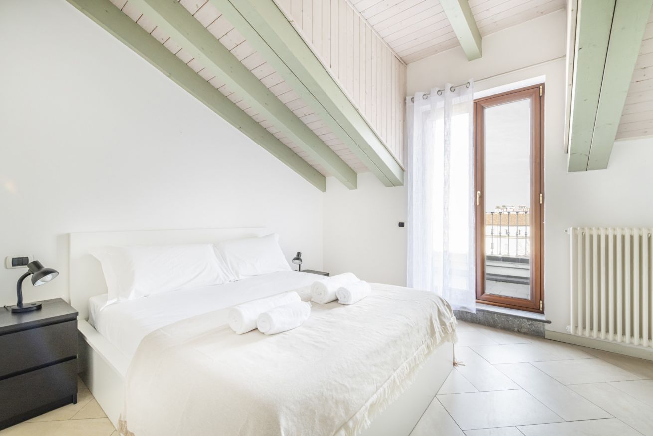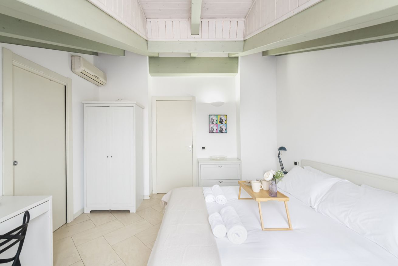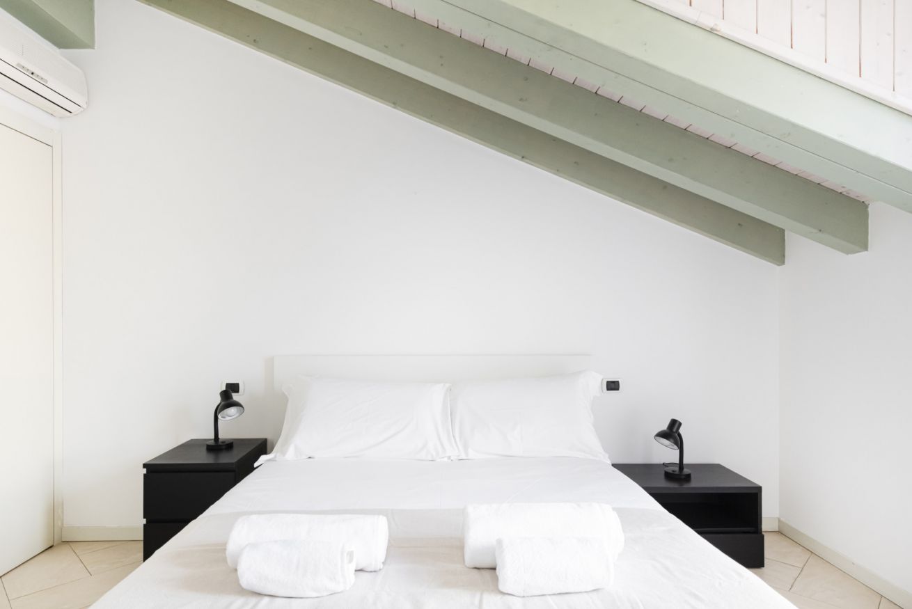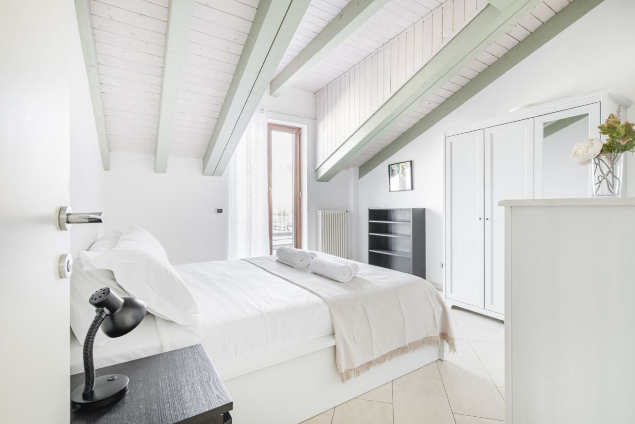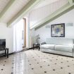 L’ingresso conduce a una spaziosa zona living, caratterizzata da soffitti mansardati, pavimenti in ceramica chiara e grandi portefinestre che inondano l’ambiente di luce naturale. Il soggiorno ospita un comodo divano letto, Smart TV e una raffinata zona pranzo con tavolo in vetro e sedute di design, perfettamente integrata nello spazio.