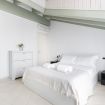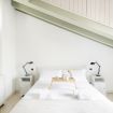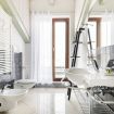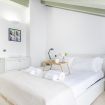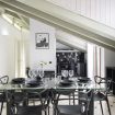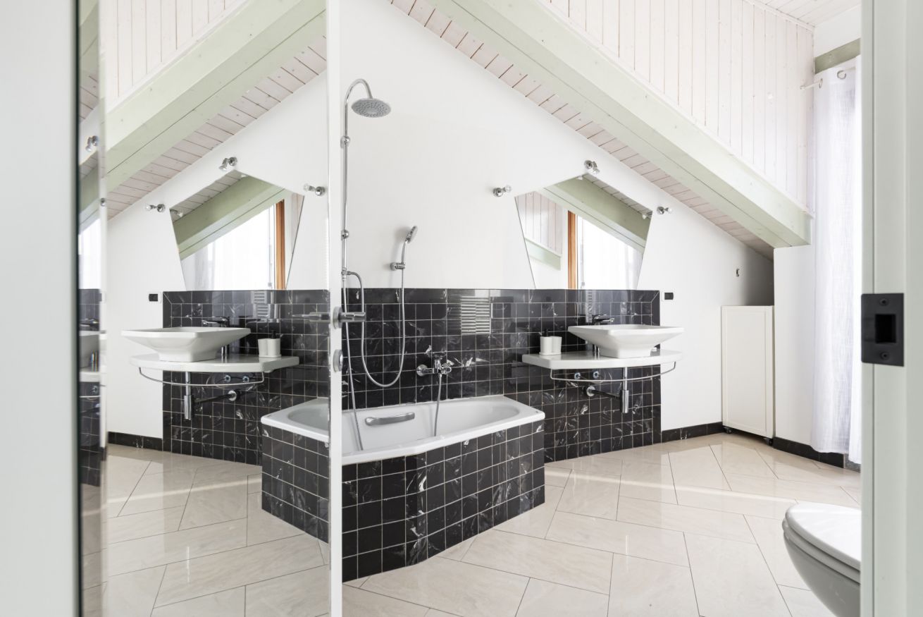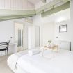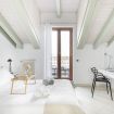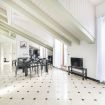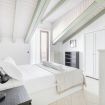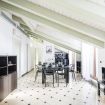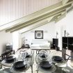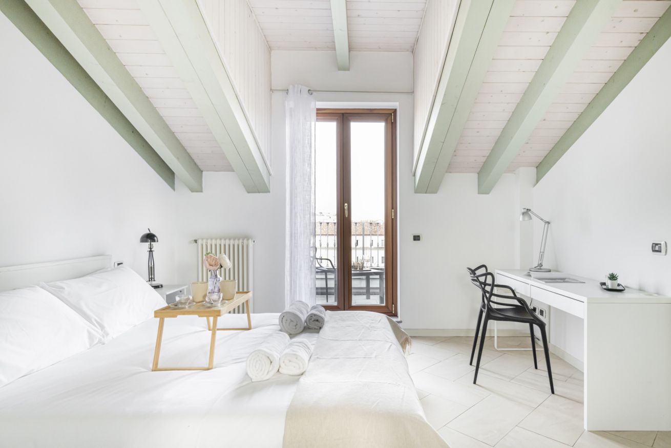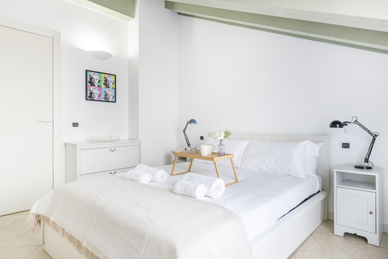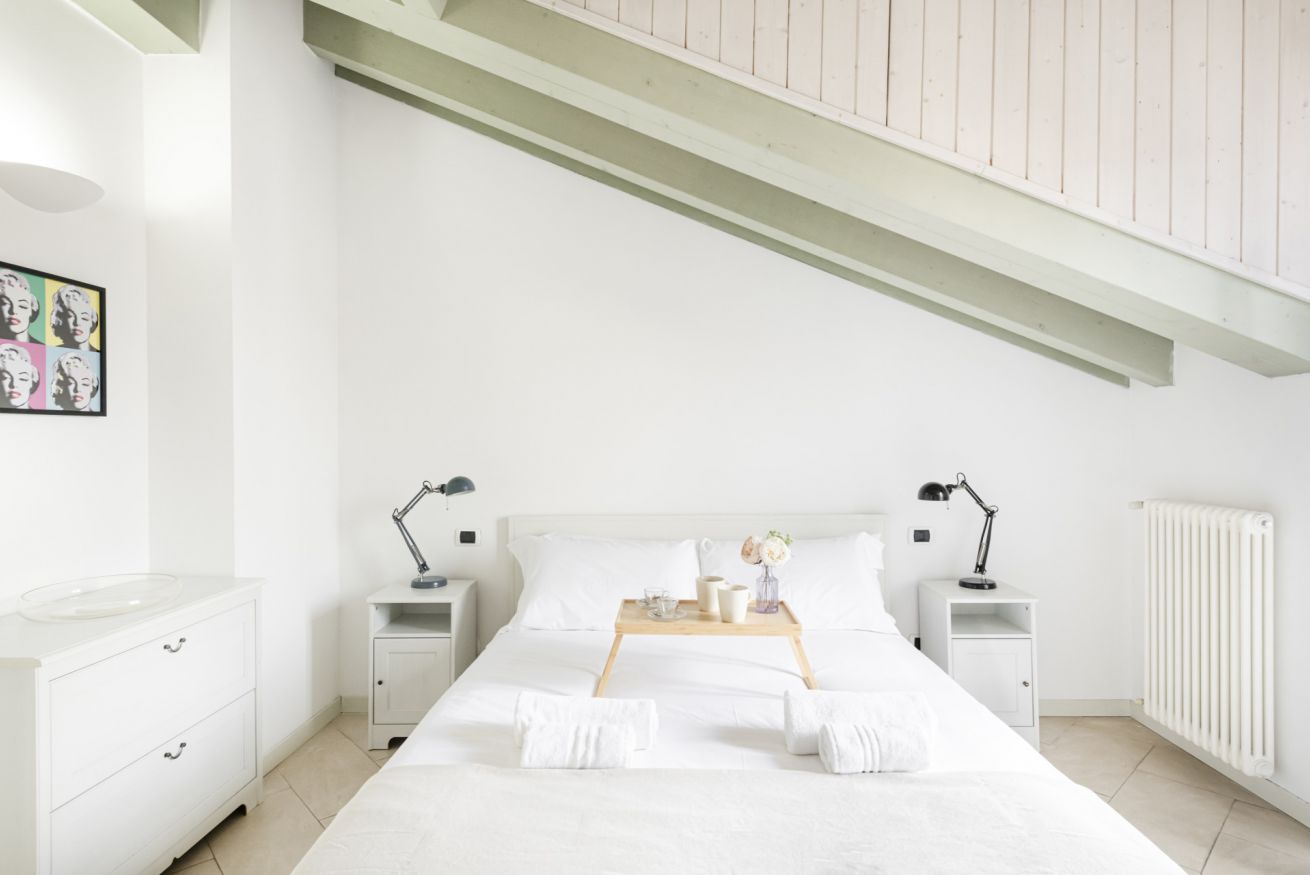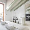 L’ingresso conduce a una spaziosa zona living, caratterizzata da soffitti mansardati, pavimenti in ceramica chiara e grandi portefinestre che inondano l’ambiente di luce naturale. Il soggiorno ospita un comodo divano letto, Smart TV e una raffinata zona pranzo con tavolo in vetro e sedute di design, perfettamente integrata nello spazio.