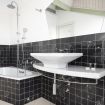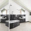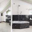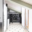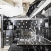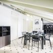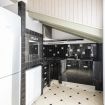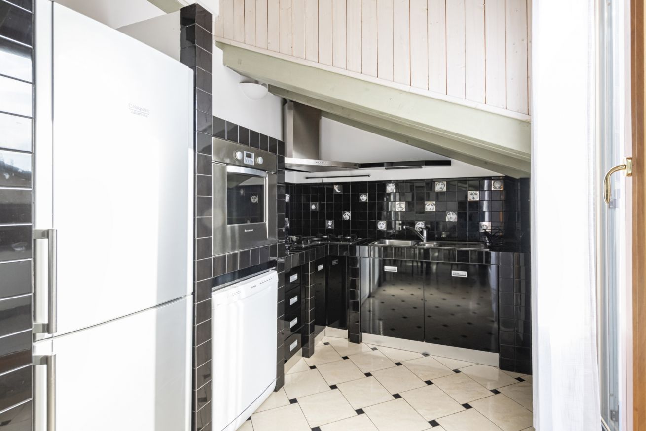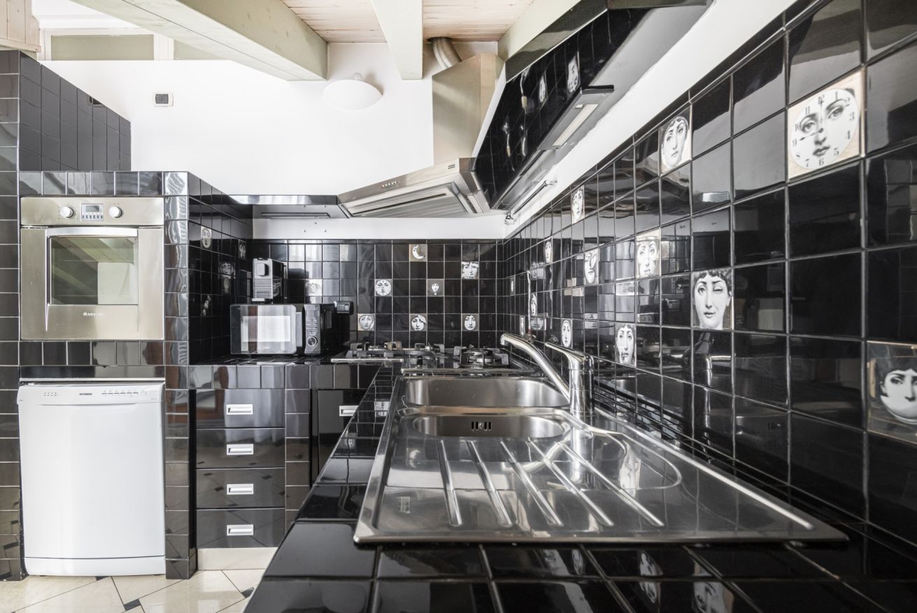 Adiacente, la cucina ad angolo è progettata su misura e rifinita con piastrelle nere decorative: completa di forno, piano cottura, lavastoviglie, frigorifero e ampi piani di lavoro, è funzionale e ben organizzata.