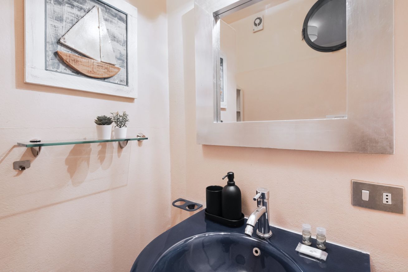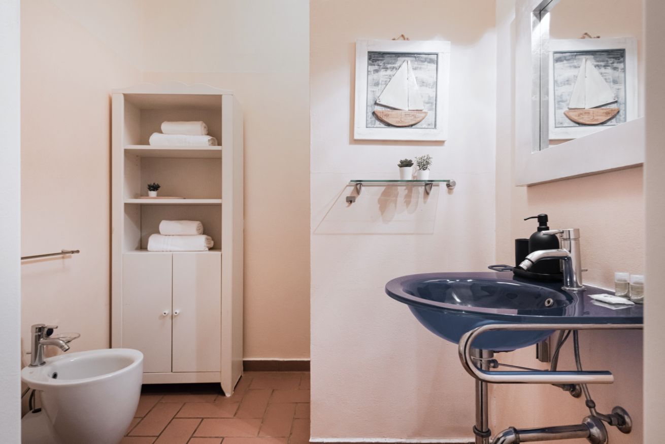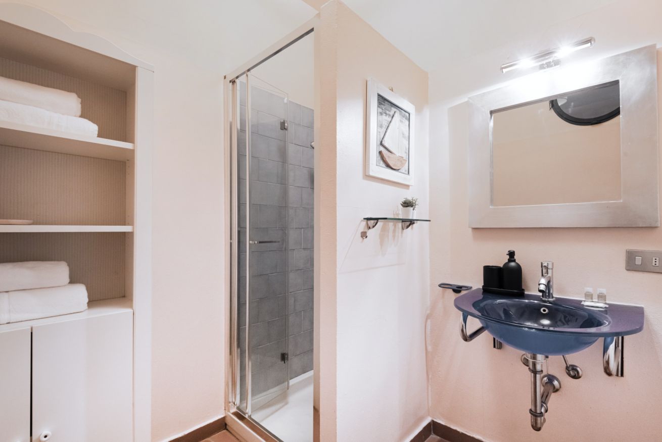 Il bagno è completamente arredato con eleganza e funzionalità, dotato di una doccia moderna e spaziosa, con finiture di pregio che aggiungono un tocco di classe.