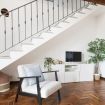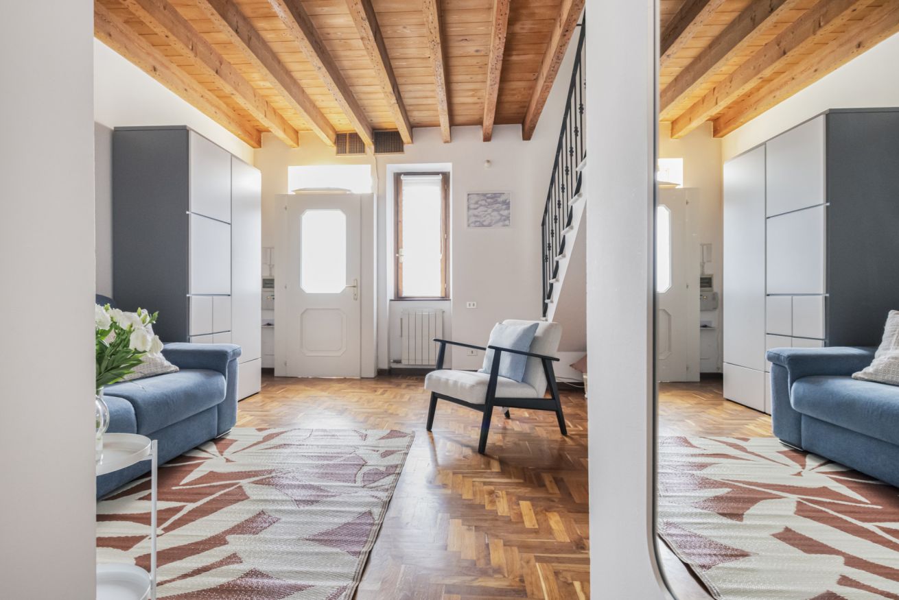 All'ingresso si è accolti da un'ampia e luminosa zona living, dotata di un pratico armadio, un soffice divano letto matrimoniale e una smart TV. La cucina combina praticità e estetica dal design contemporaneo: equipaggiata di stoviglie e utensili, frigorifero con scompartimento freezer, forno, forno a microonde, lavastoviglie, lavatrice, macchina del caffè, bollitore e un tavolo spazioso pensato per i momenti di convivialità e che all’occasione può trasformarsi in una comoda postazione smartworking, è il luogo ideale per soddisfare le esigenze culinarie più raffinate. Completano il primo piano un comodo ripostiglio e un accogliente bagno dotato di vasca, lavandino e bidet, morbida biancheria, asciugacapelli e welcome kit con shampoo, bagnodoccia e saponetta.