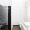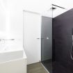 Il bagno moderno è dotato di una doccia walk-in con vetro scuro, combinando estetica e funzionalità.
