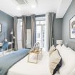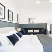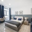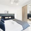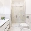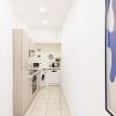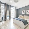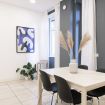 All’interno, le tre camere matrimoniali sono arredate con gusto contemporaneo e raffinato: due dispongono di eleganti armadi e soft lighting, mentre la seconda camera apre a finestre che catturano la luce calda del mattino. Il soggiorno, con divano colorato e architettura luminosa, si articola intorno a una cucina a vista con design lineare e tavolo da pranzo moderno, offrendo un soggiorno conviviale e rilassante. Da qui, accedi a un balcone intimo affacciato sul cortile interno, che favorisce il relax lontano dal trambusto cittadino.
