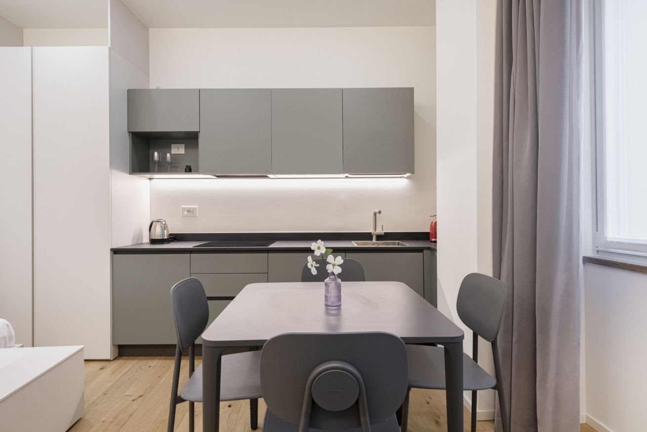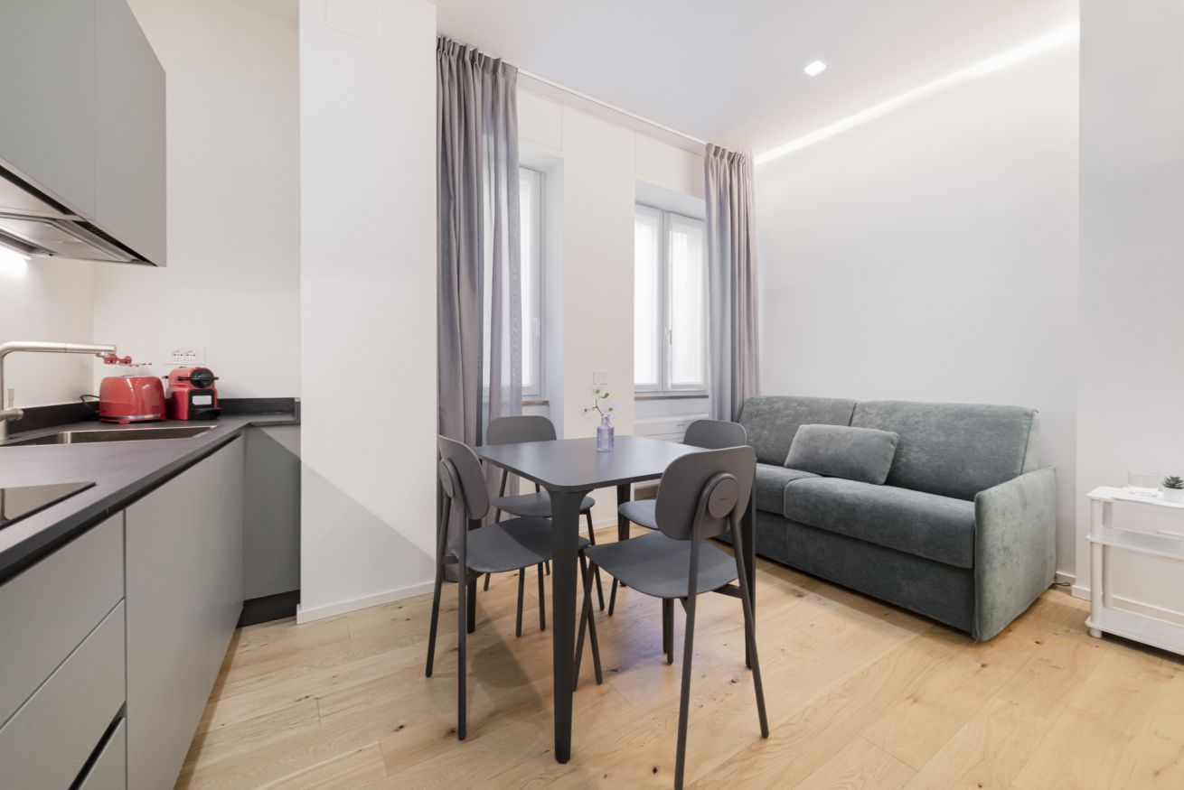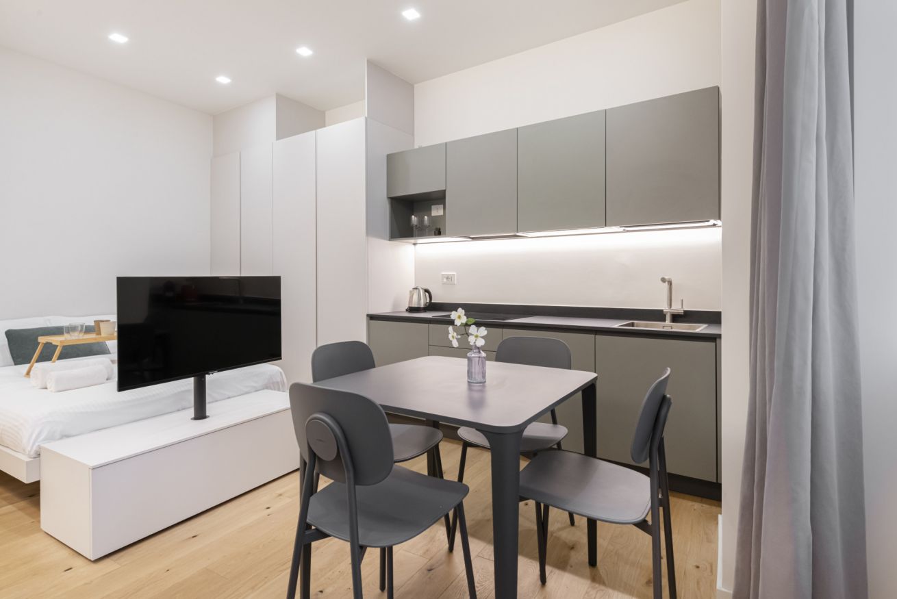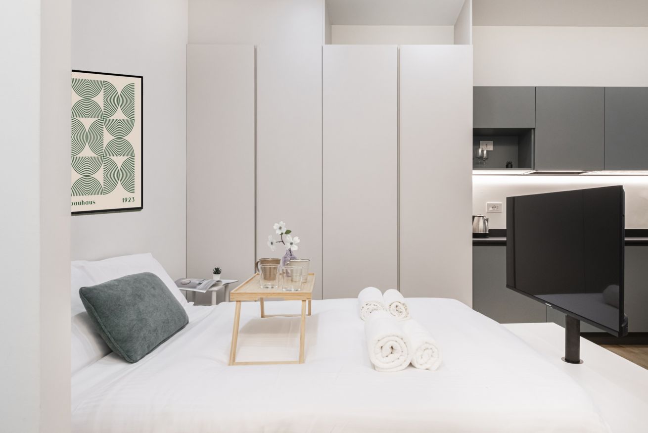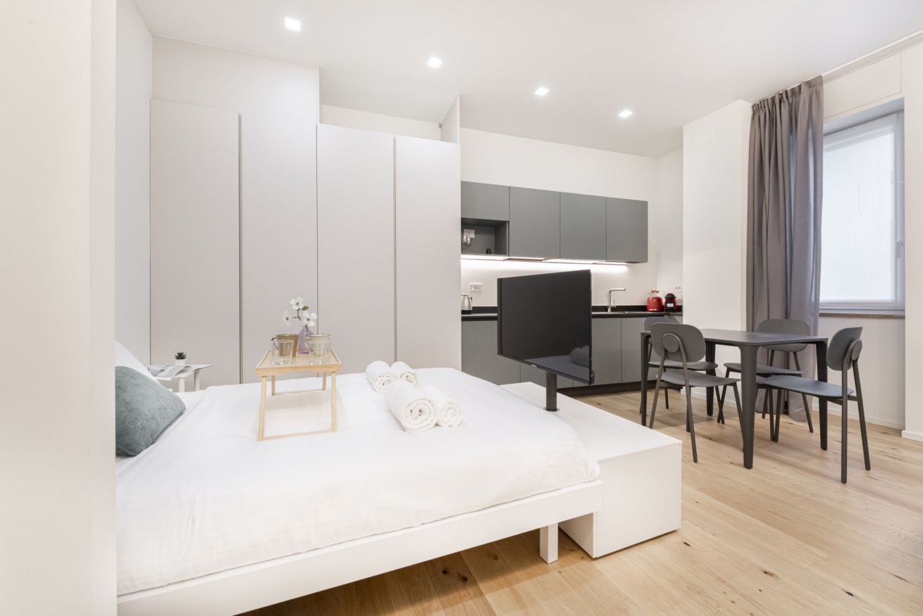L’open space si sviluppa in modo fluido, con una zona living ben organizzata che accoglie un comodo divano letto, perfetto per garantire funzionalità e versatilità, affiancato da una cucina lineare completamente integrata, dotata di elettrodomestici e finiture minimal che si fondono con eleganza nell’ambiente. La zona notte, caratterizzata da un letto matrimoniale e dettagli tessili raffinati, offre un’atmosfera rilassante e curata, ideale per il riposo.