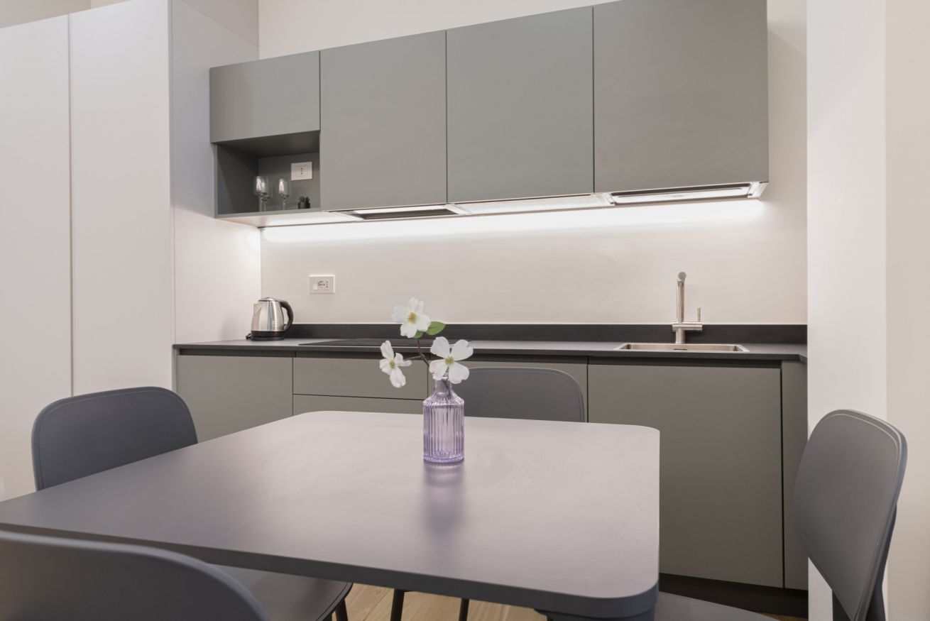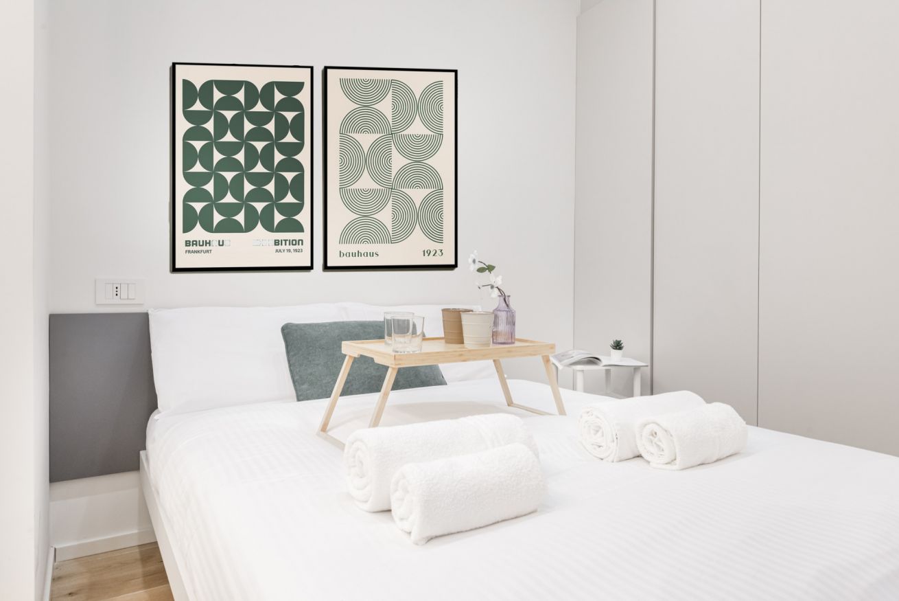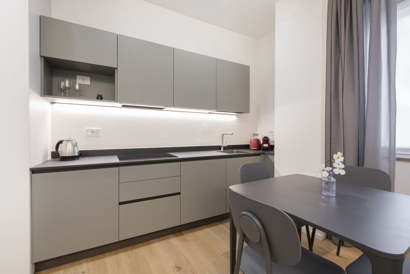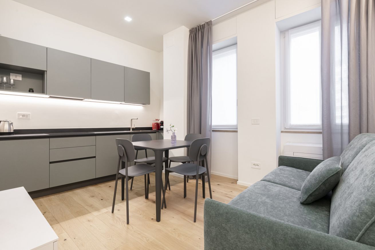 L’open space si sviluppa in modo fluido, con una zona living ben organizzata che accoglie un comodo divano letto, perfetto per garantire funzionalità e versatilità, affiancato da una cucina lineare completamente integrata, dotata di elettrodomestici e finiture minimal che si fondono con eleganza nell’ambiente. La zona notte, caratterizzata da un letto matrimoniale e dettagli tessili raffinati, offre un’atmosfera rilassante e curata, ideale per il riposo.