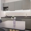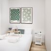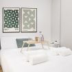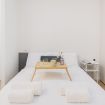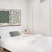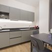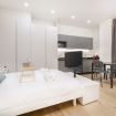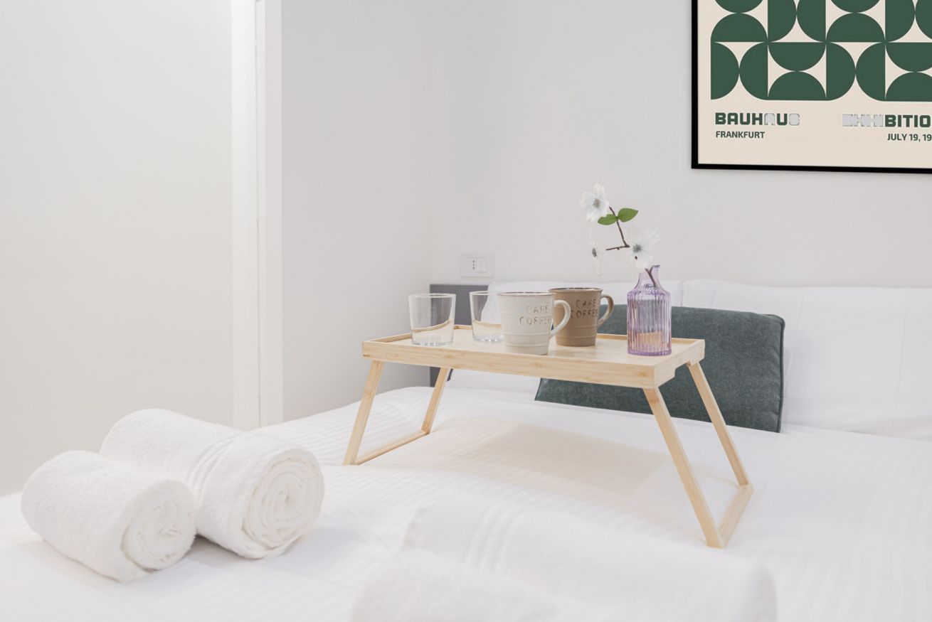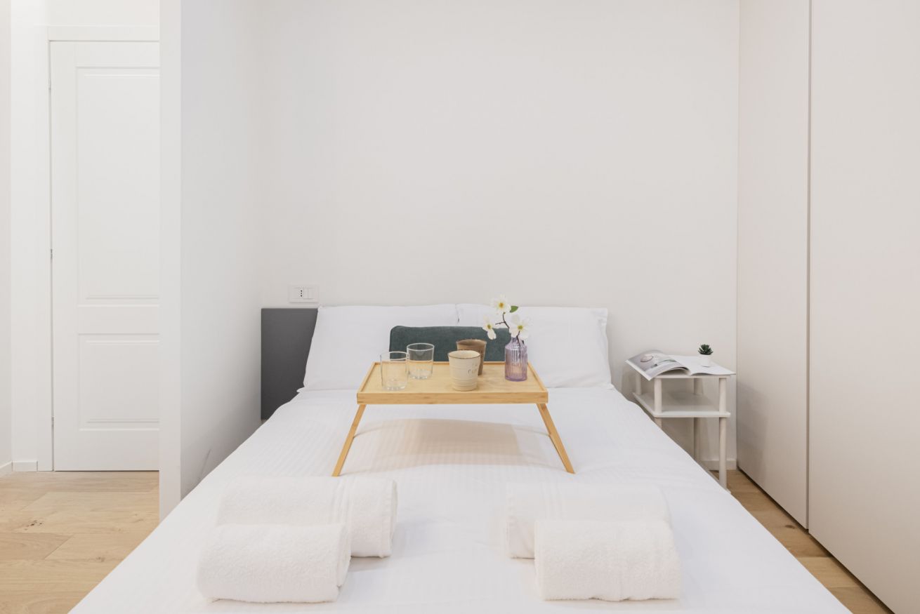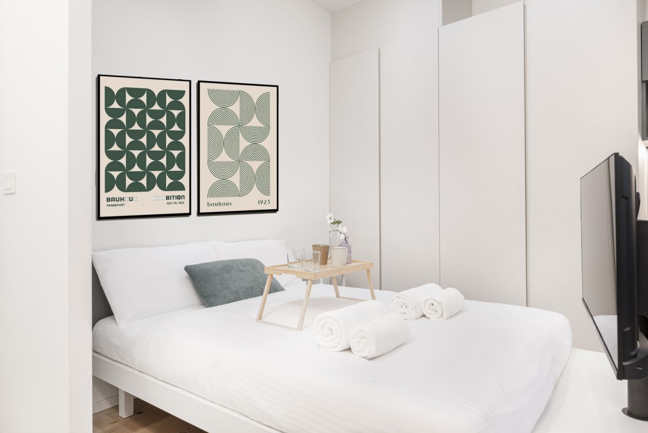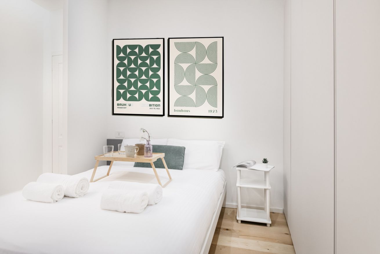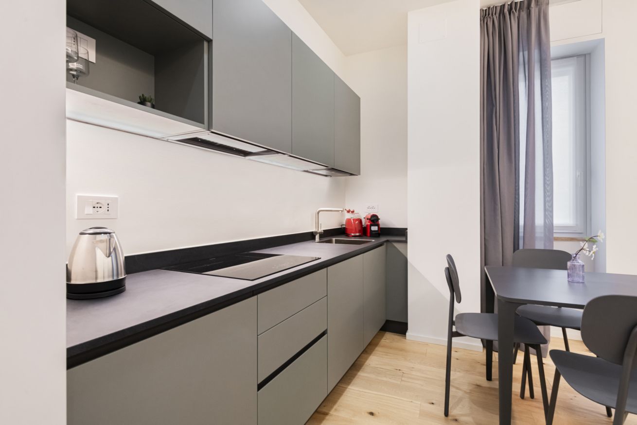 L’open space si sviluppa in modo fluido, con una zona living ben organizzata che accoglie un comodo divano letto, perfetto per garantire funzionalità e versatilità, affiancato da una cucina lineare completamente integrata, dotata di elettrodomestici e finiture minimal che si fondono con eleganza nell’ambiente. La zona notte, caratterizzata da un letto matrimoniale e dettagli tessili raffinati, offre un’atmosfera rilassante e curata, ideale per il riposo.