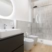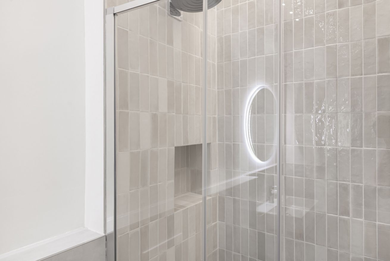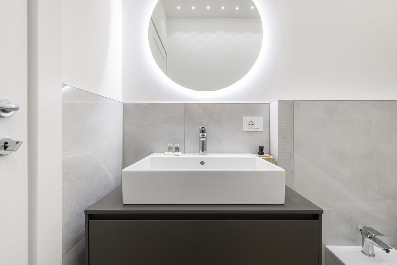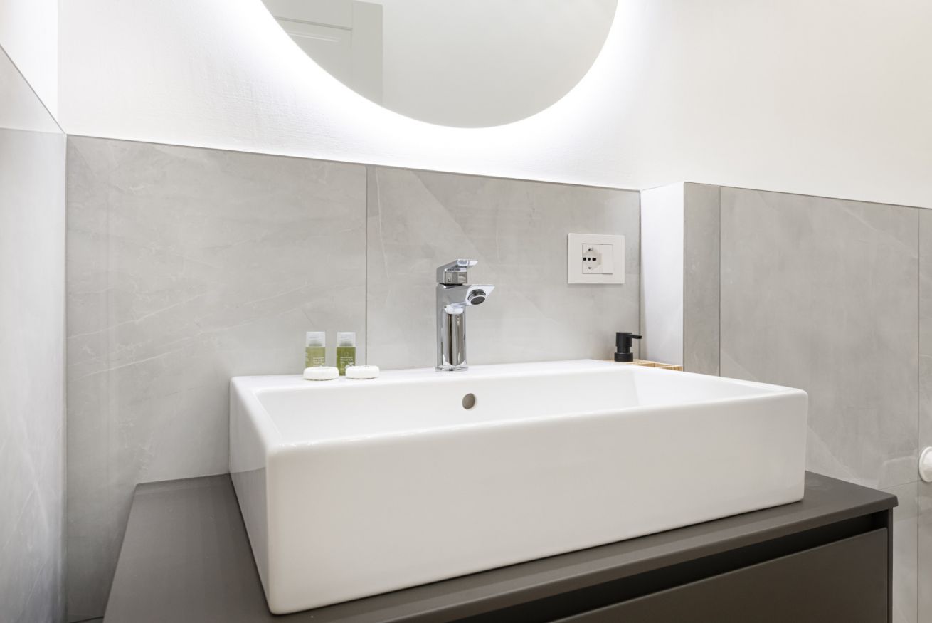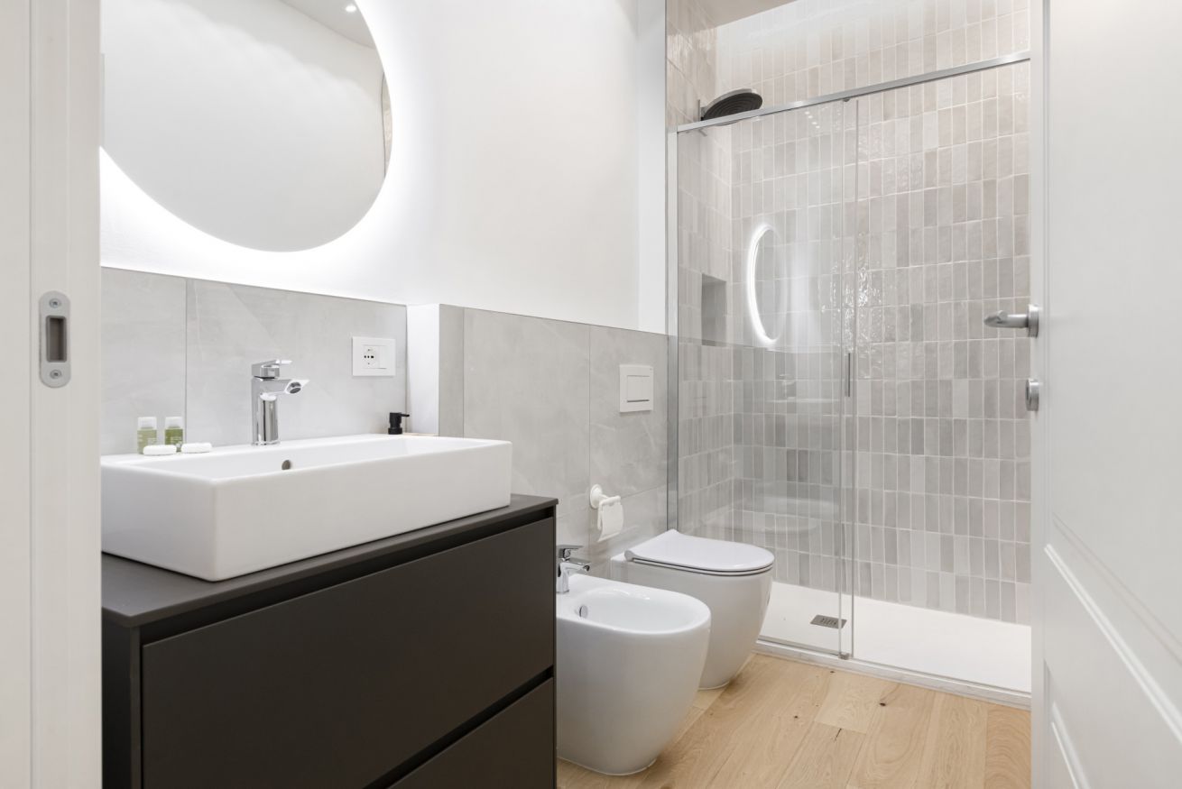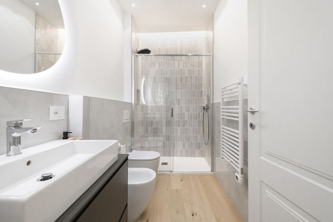 Il bagno, moderno e funzionale, presenta una spaziosa doccia con finiture contemporanee, sanitari sospesi e materiali di qualità che esaltano il comfort quotidiano. Completano la proprietà pavimentazione in legno, illuminazione studiata e aria condizionata, elementi che contribuiscono a creare un ambiente ricercato, pratico e perfettamente equilibrato tra estetica e funzionalità, ideale sia per soggiorni brevi che prolungati.