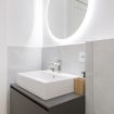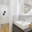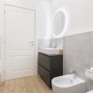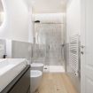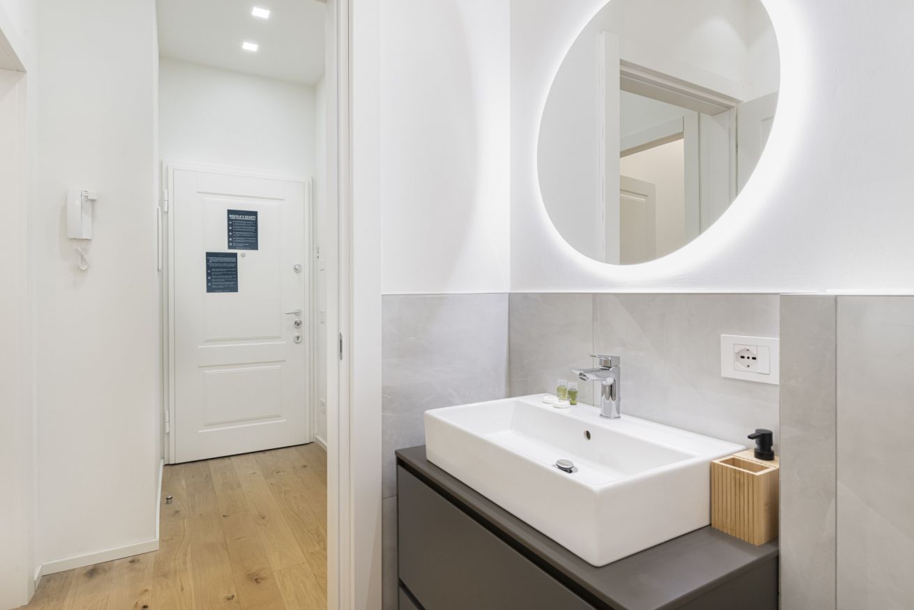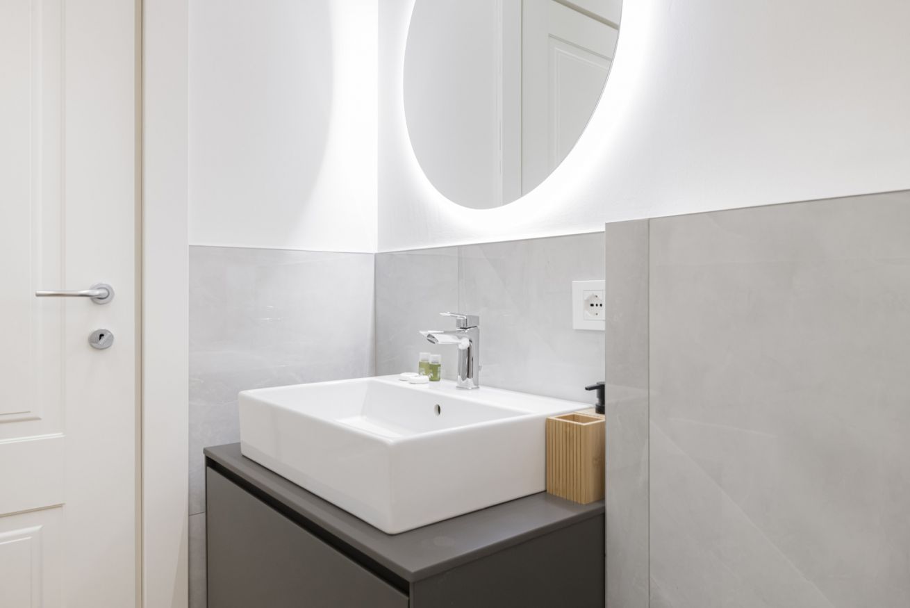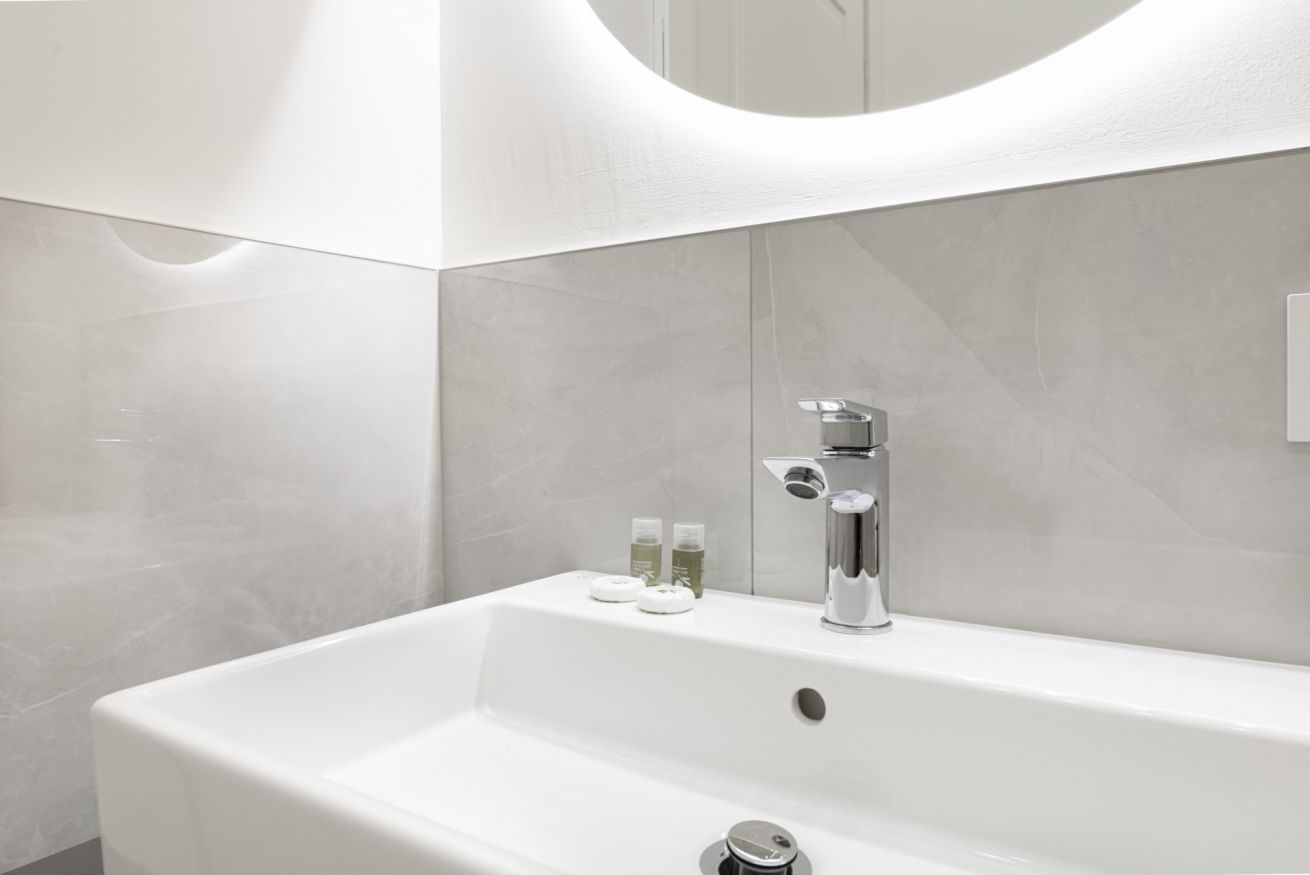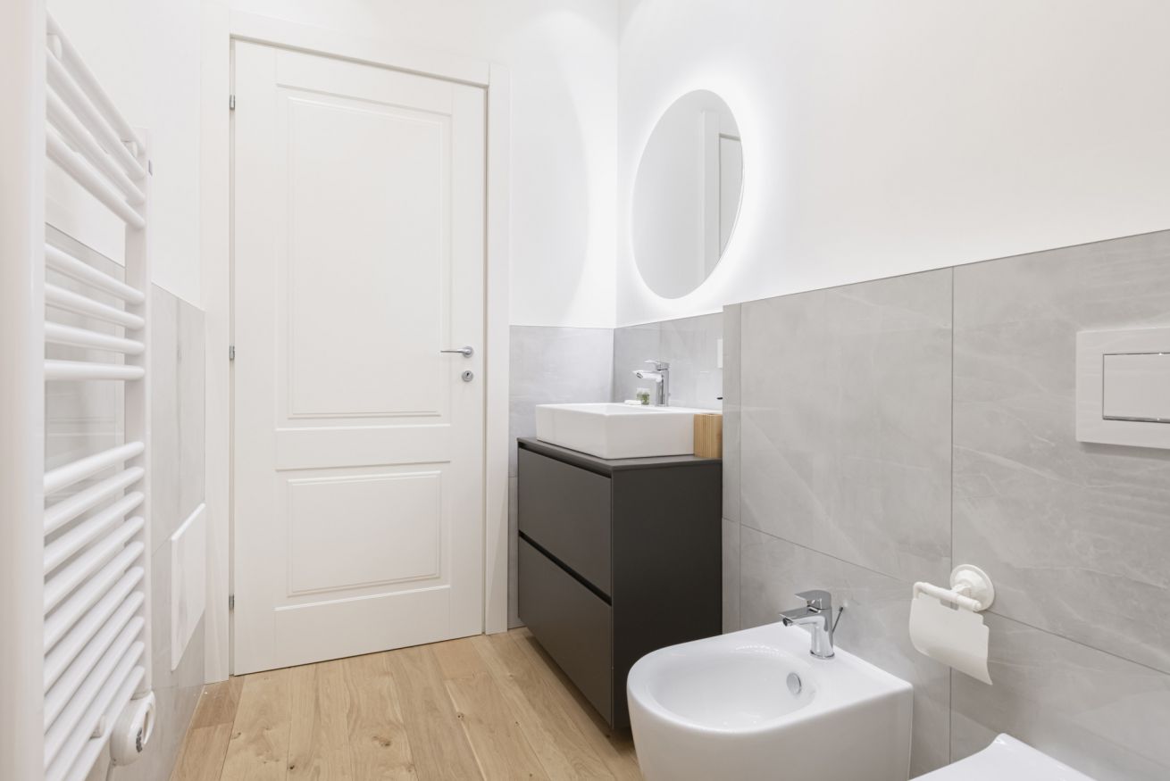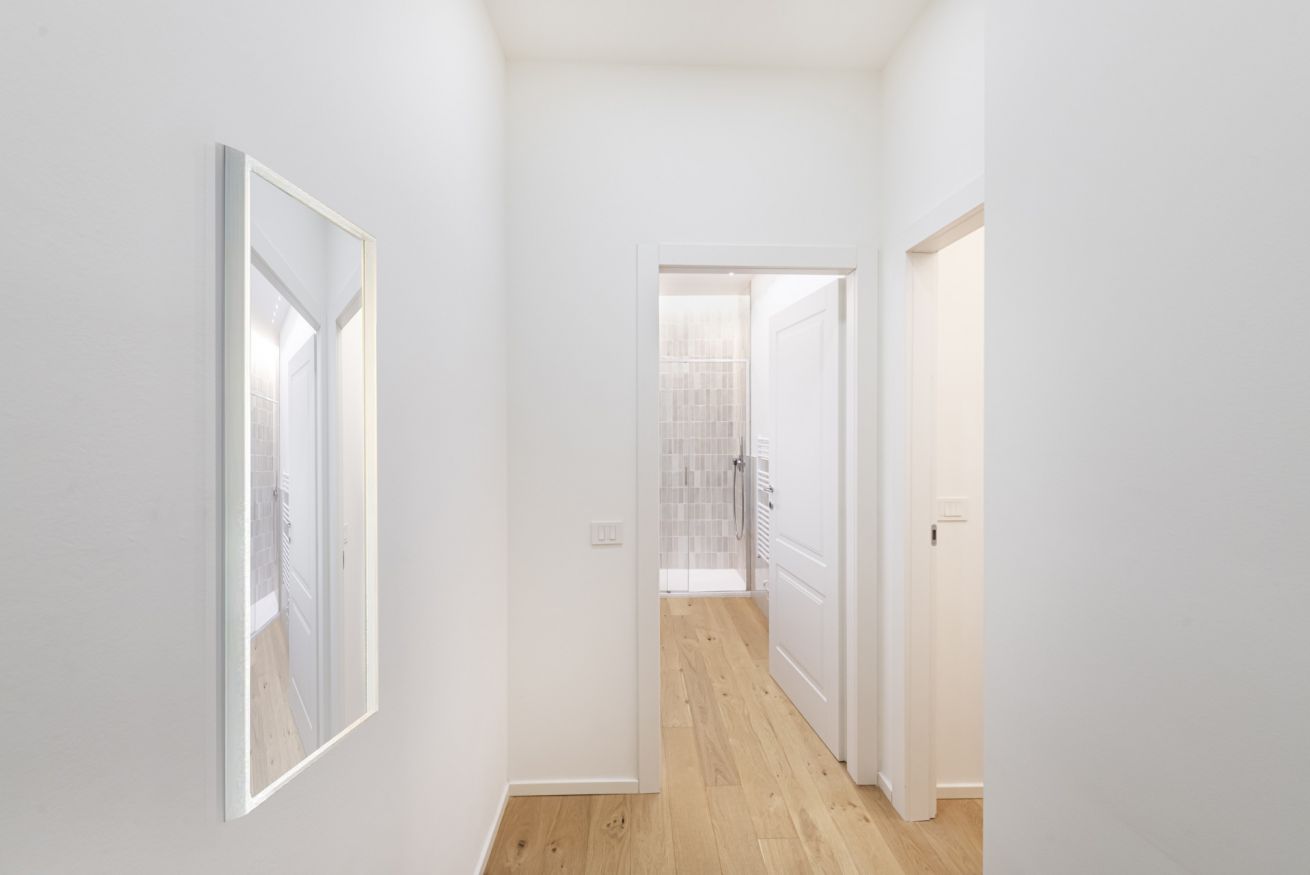 Il bagno, moderno e funzionale, presenta una spaziosa doccia con finiture contemporanee, sanitari sospesi e materiali di qualità che esaltano il comfort quotidiano. Completano la proprietà pavimentazione in legno, illuminazione studiata e aria condizionata, elementi che contribuiscono a creare un ambiente ricercato, pratico e perfettamente equilibrato tra estetica e funzionalità, ideale sia per soggiorni brevi che prolungati.