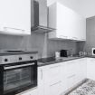 Adiacente al soggiorno, troviamo una cucina lineare di ultima generazione, completamente attrezzata con elettrodomestici moderni, inclusi forno, frigorifero, lavastoviglie e piano cottura, progettata per soddisfare tutte le esigenze culinarie. La cucina, con le sue finiture di alta qualità, offre uno spazio funzionale e raffinato.