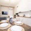 L’ingresso conduce a una zona living raccolta e accogliente, arredata con gusto e dotata di comodo divano letto, Smart TV e area pranzo funzionale, pensata per momenti conviviali. Accanto, la cucina lineare e moderna, completamente attrezzata con elettrodomestici di ultima generazione, rende semplice e piacevole organizzare colazioni, pranzi e cene anche durante soggiorni prolungati.