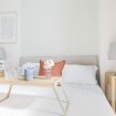 L’ingresso si apre su un ampio soggiorno luminoso, impreziosito da uno splendido parquet a vista e arredato con gusto contemporaneo, un comodo divano letto, una Smart TV e una zona pranzo integrata compongono uno spazio accogliente, ideale per rilassarsi o condividere momenti conviviali. L’ angolo cottura, compatto ma completo, è dotato di tutti gli elettrodomestici essenziali per cucinare in autonomia.