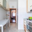 The apartment consists of a large living room, equipped with a comfortable sofa, smart TV and large dining table, ideal for relaxing and benefiting from quiet moments. The kitchen, adjacent to the living room, is fully equipped, and also benefits from a table where you can comfortably stay as well as being illuminated by a large French window that leads to a small terrace overlooking the inner courtyard of the building, ideal for a regenerating break.