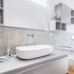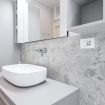 Il bagno, finemente arredato, è dotato di una spaziosa doccia in vetro, combinando stile e praticità con materiali di pregio e dettagli eleganti che creano un ambiente rilassante e funzionale.