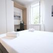 La cucina moderna e sofisticata è completamente attrezzata. Nella zona notte ti aspetta una accogliente camera da letto, altrettanto luminosa e spaziosa, con un letto ultra-confortevole e una scrivania. Il bagno, raffinato e rilassante, dispone di sanitari nuovi e una doccia di design, ideale per il relax dopo una giornata di esplorazione.