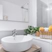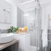 Il bagno, recentemente ristrutturato, dispone di una moderna doccia a vetro, pensata per garantire momenti di puro relax. Ogni dettaglio di questo monolocale è stato studiato per offrire un'atmosfera raffinata e sofisticata.