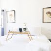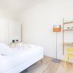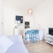 Il soggiorno è spazioso e ben arredato, dotato di un confortevole divano letto e una smart TV, ideale per intrattenimento domestico di qualità. La cucina, moderna e completamente integrata, offre una pratica penisola che può fungere da area per i pasti veloci o come ulteriore spazio di lavoro, arricchendo l'ambiente con un tocco di design contemporaneo.