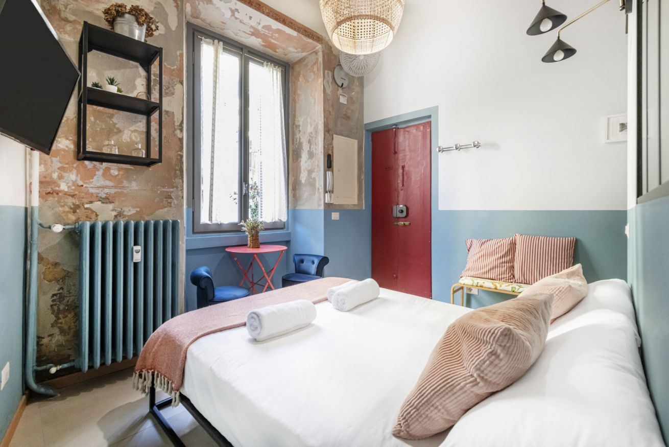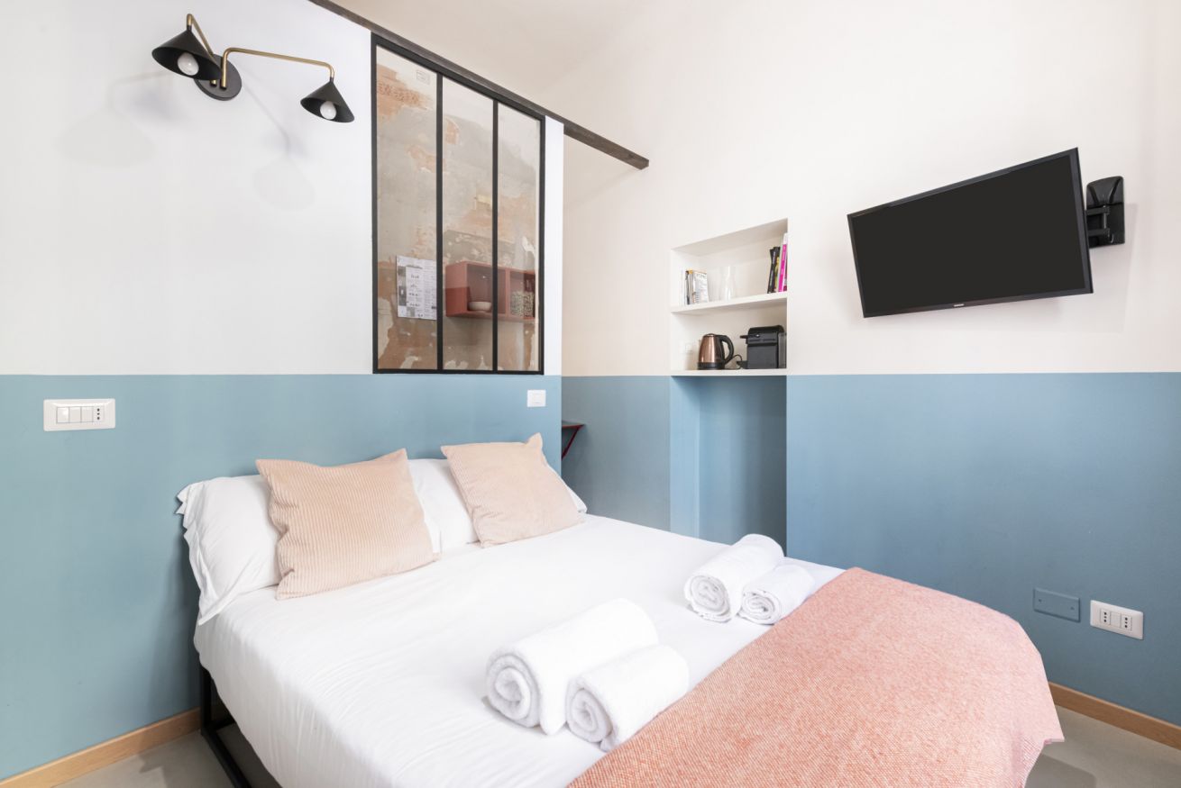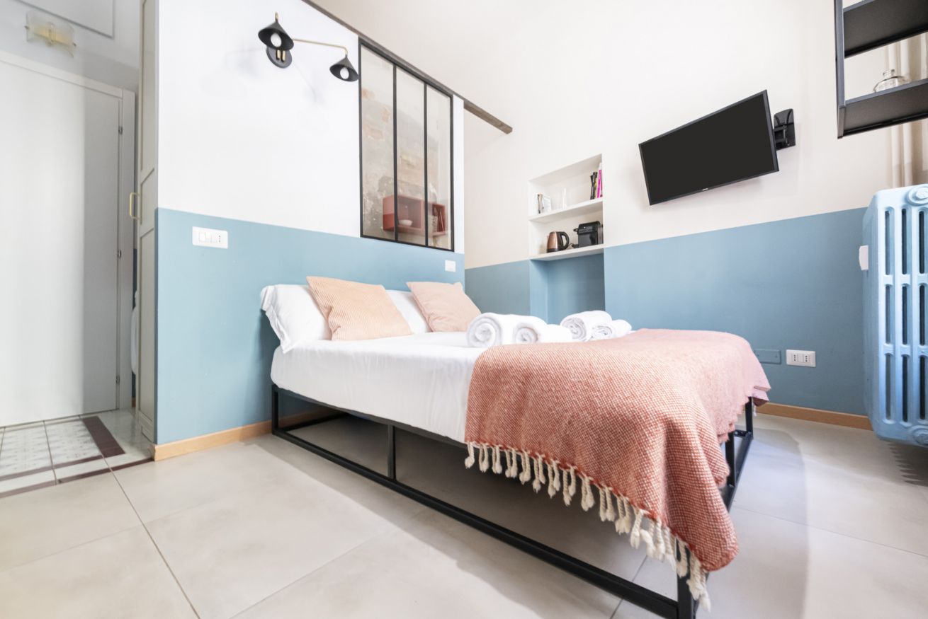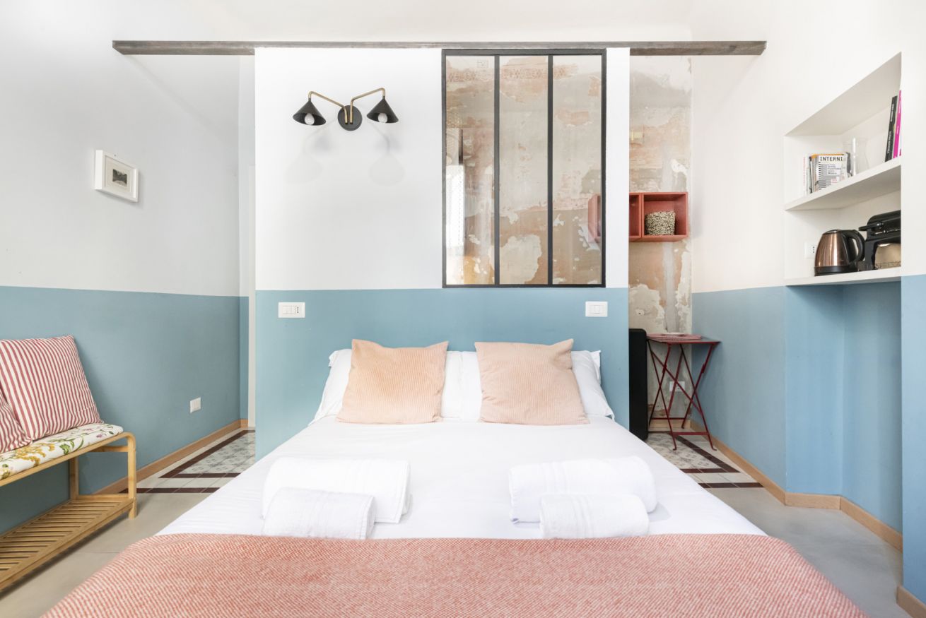 L’ingresso conduce alla zona notte con letto matrimoniale dal taglio moderno, impreziosita da pareti bicolor nei toni dell’azzurro e del bianco, TV a parete e illuminazione calda che crea un’atmosfera intima e rilassante. Alcune pareti sono state volutamente lasciate con finiture originali e materiche, valorizzando l’anima storica dell’immobile e conferendo un raffinato effetto industrial chic.