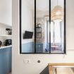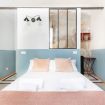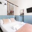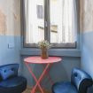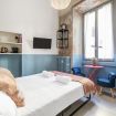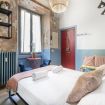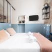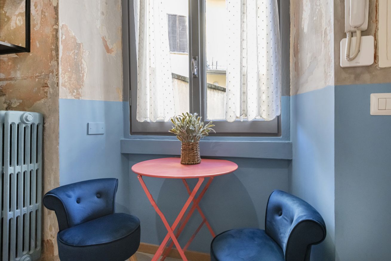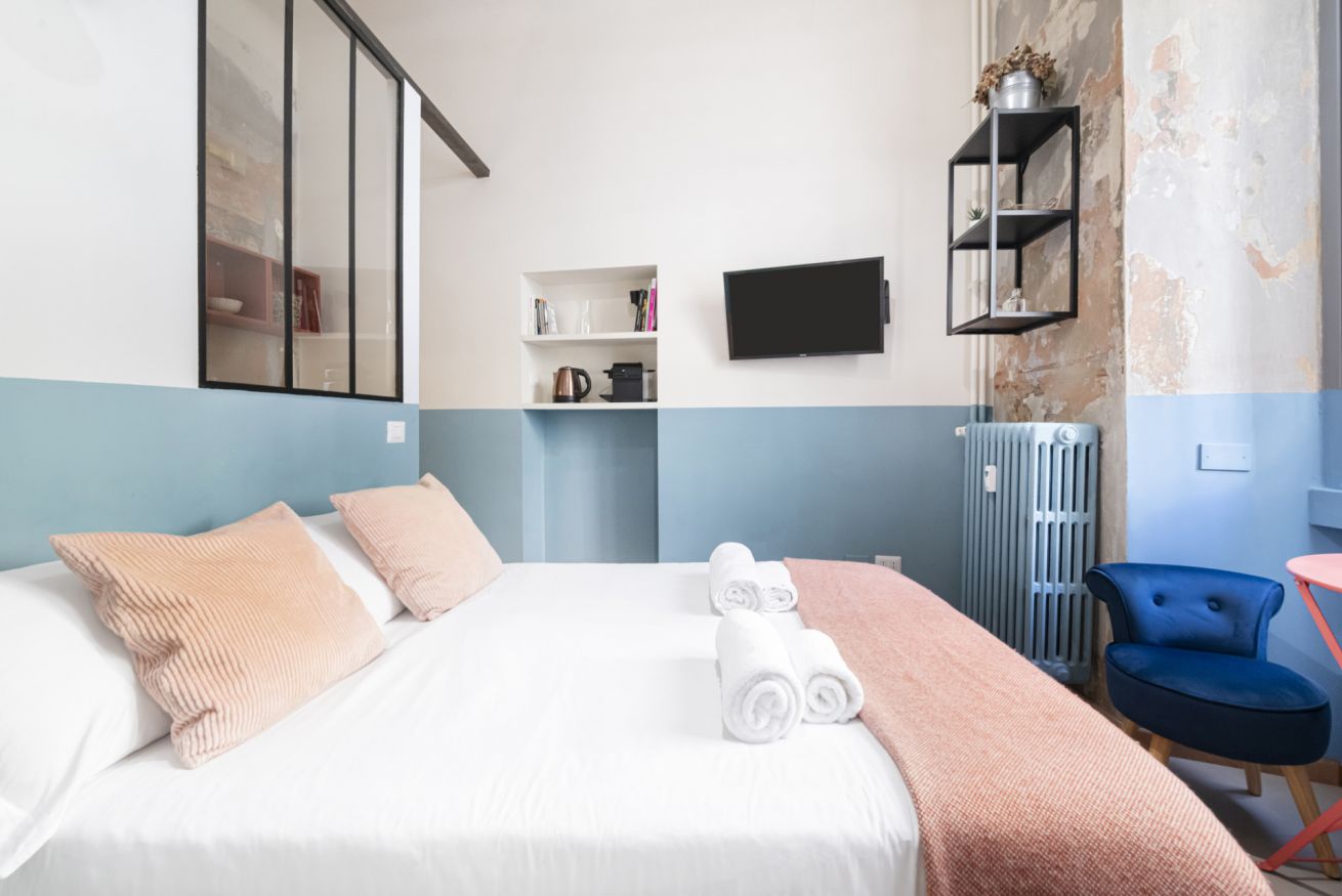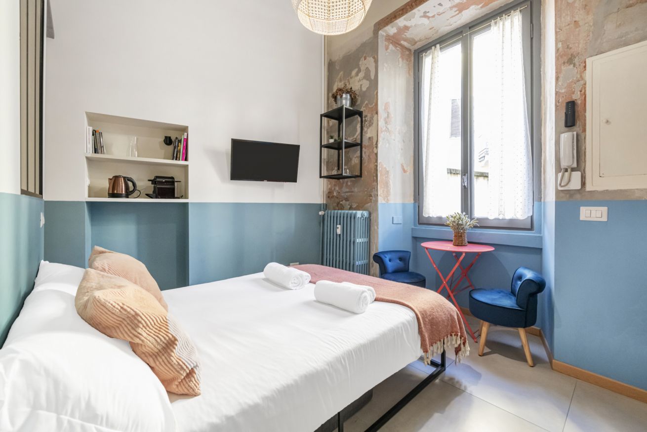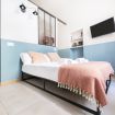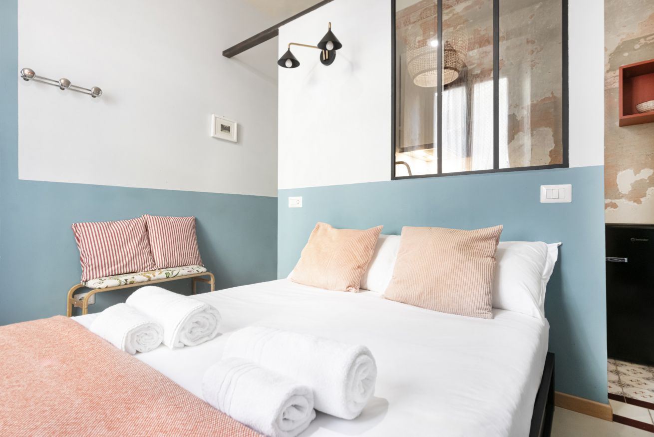 L’ingresso conduce alla zona notte con letto matrimoniale dal taglio moderno, impreziosita da pareti bicolor nei toni dell’azzurro e del bianco, TV a parete e illuminazione calda che crea un’atmosfera intima e rilassante. Alcune pareti sono state volutamente lasciate con finiture originali e materiche, valorizzando l’anima storica dell’immobile e conferendo un raffinato effetto industrial chic.