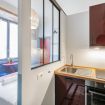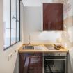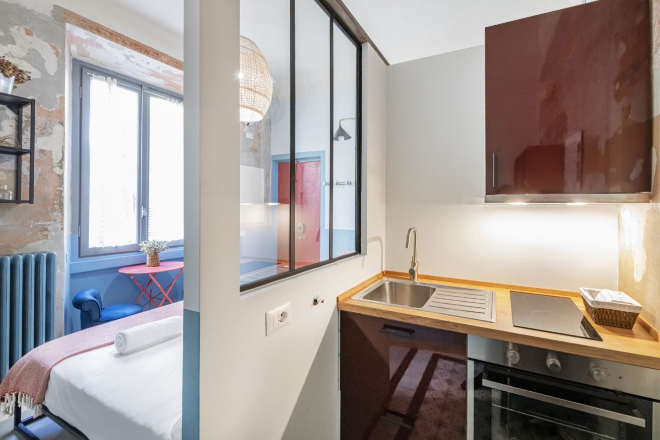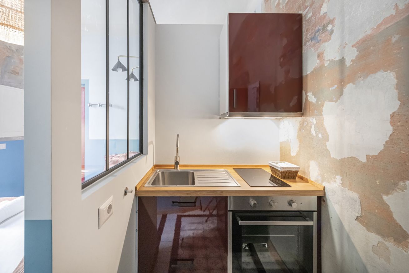 L’angolo cottura, compatto ma funzionale, è dotato di piano cottura, forno, lavello in acciaio, mini frigo, macchina del caffè e bollitore, con dettagli dai toni caldi e superfici a contrasto.