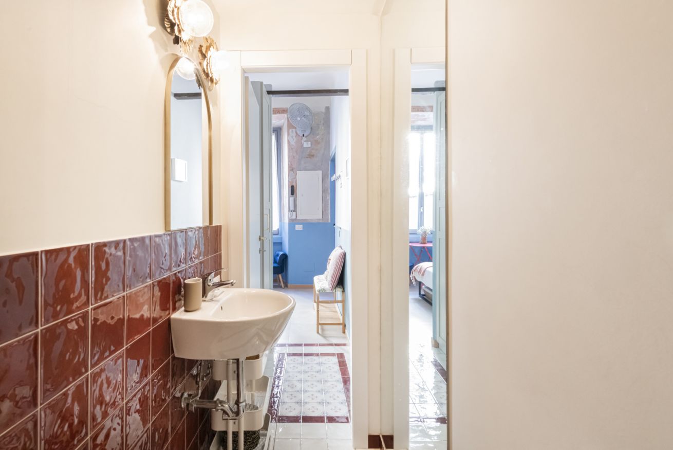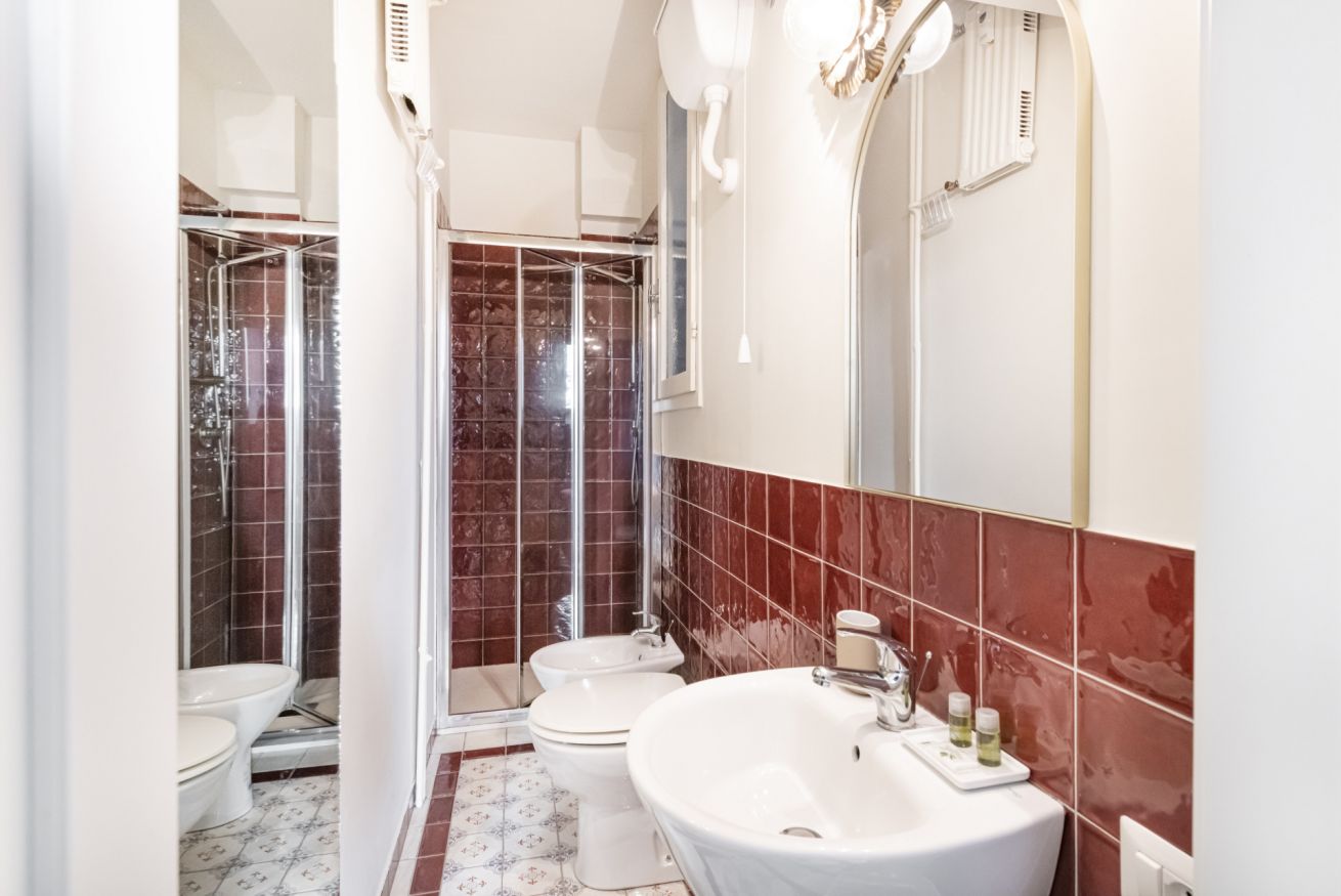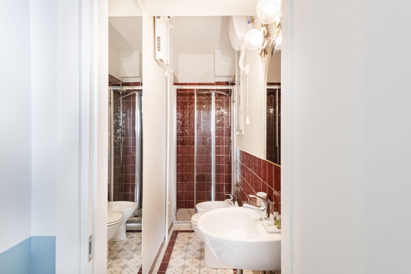Il bagno completo con doccia si distingue per i rivestimenti in ceramica decorativa e per l’atmosfera ricercata nei dettagli. Una soluzione accogliente e di carattere, perfetta per un soggiorno milanese all’insegna di stile e personalità.