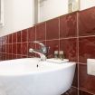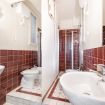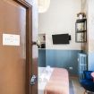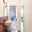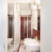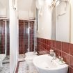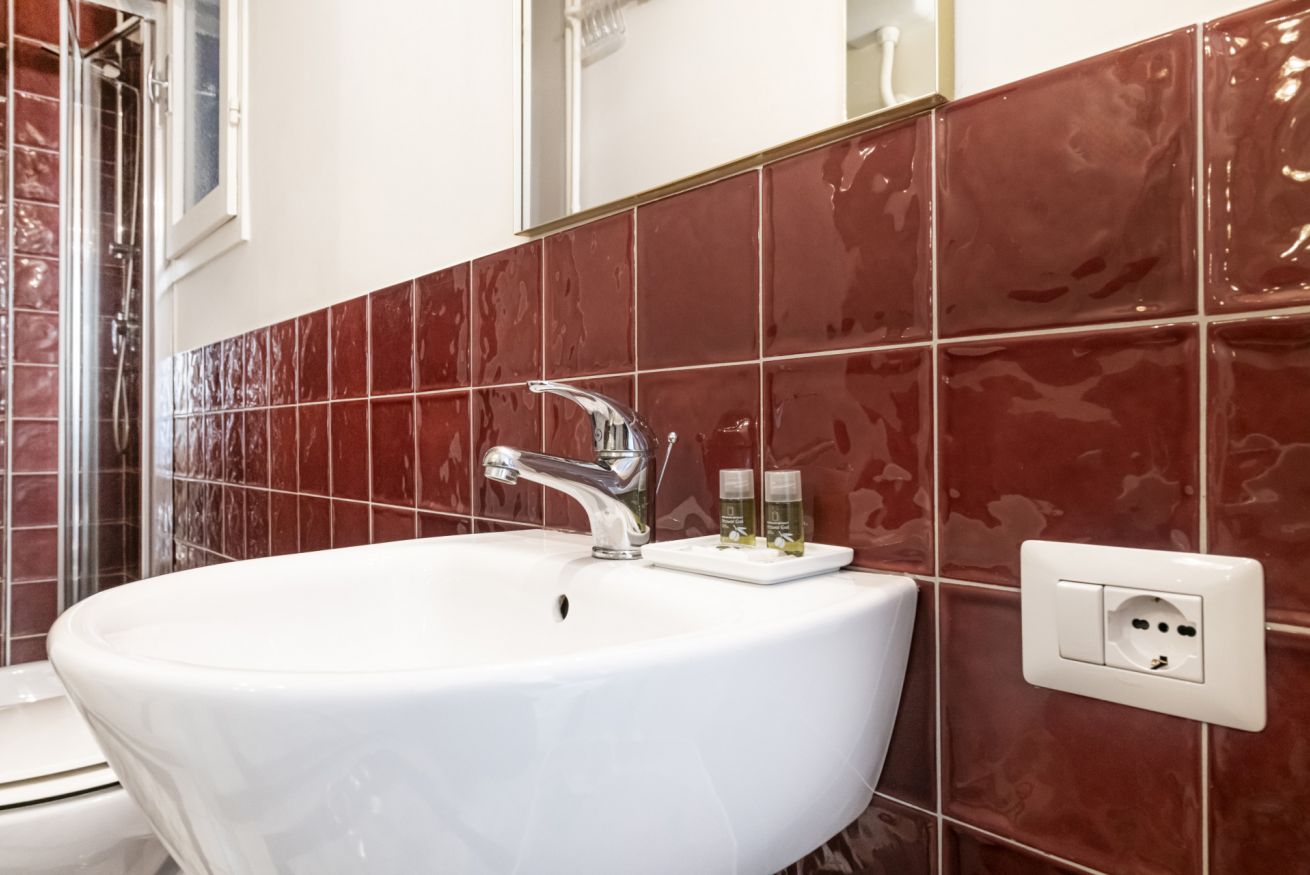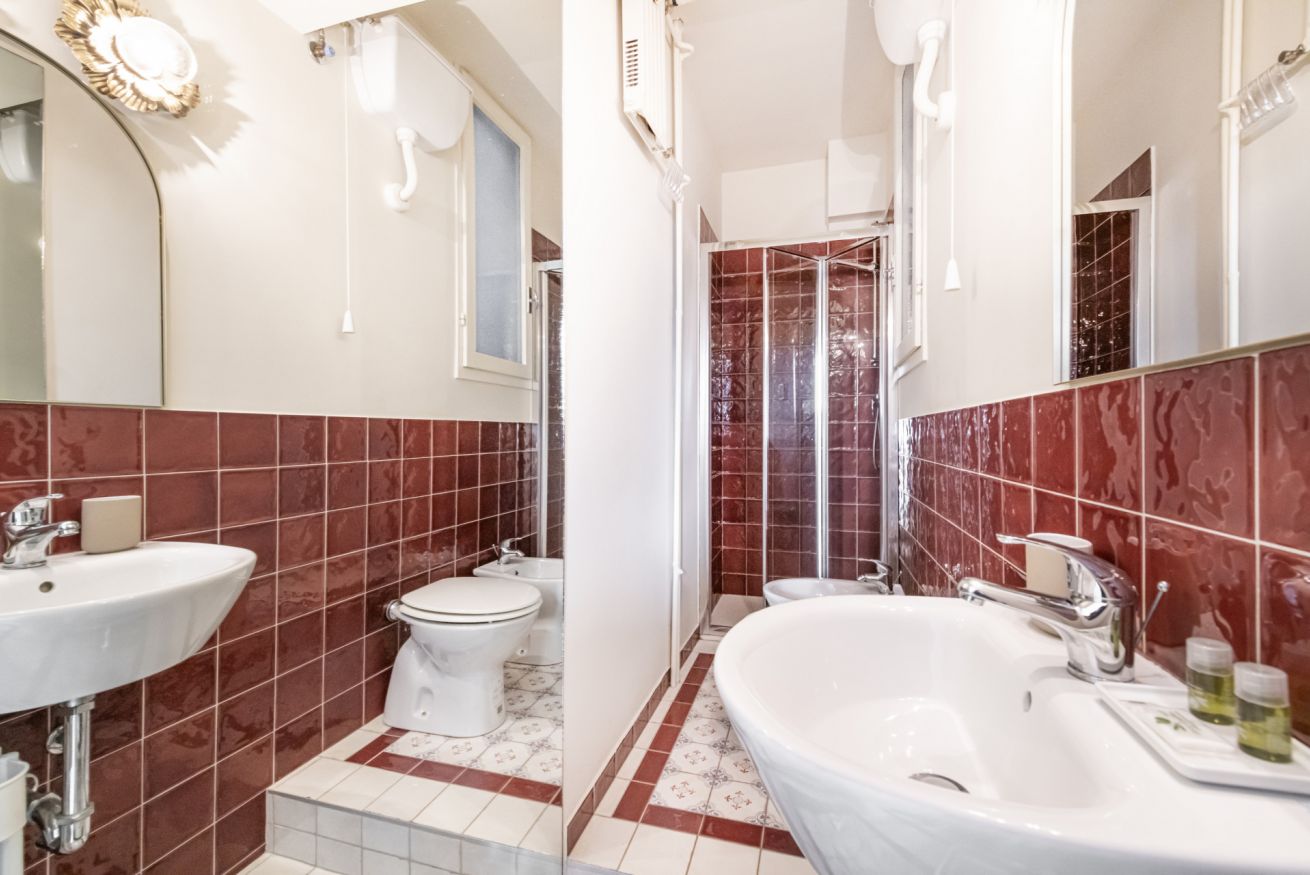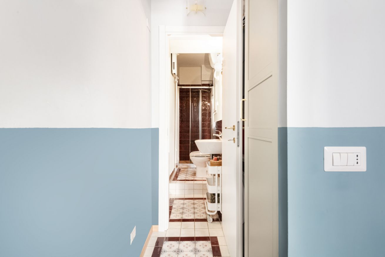 Il bagno completo con doccia si distingue per i rivestimenti in ceramica decorativa e per l’atmosfera ricercata nei dettagli. Una soluzione accogliente e di carattere, perfetta per un soggiorno milanese all’insegna di stile e personalità.